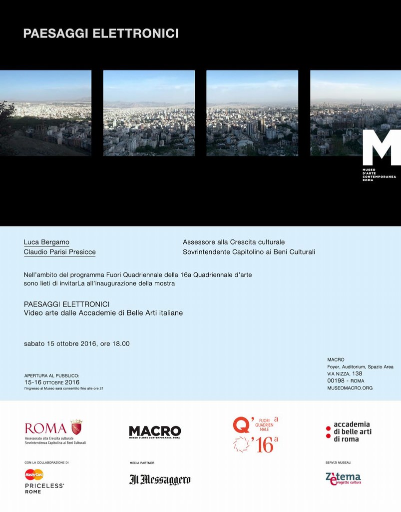 Sabato 15 e domenica 16 ottobre 2016 il MACRO - Museo d’Arte Contemporanea Roma ospiterà l'evento proiettivo Paesaggi elettronici, nell'ambito del programma Fuori Quadriennale della 16a Quadriennale d’arte “Altri tempi, altri miti” (al Palazzo delle Esposizioni dal 13 ottobre 2016 all'8 gennaio 2017).