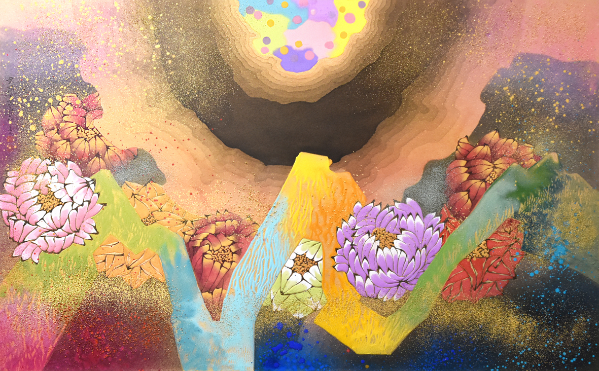 Un ultimo, ma non meno importante, elemento che caratterizza le sue opere è l’utilizzo sapiente e raffinato dell’oro, anch’esso testimone di un’arte antica che riaffiora e non è mai dimenticata, che egli accosta a inchiostri e pigmenti colorati realizzati con minerali speciali e rari, provenienti da tutto il mondo.