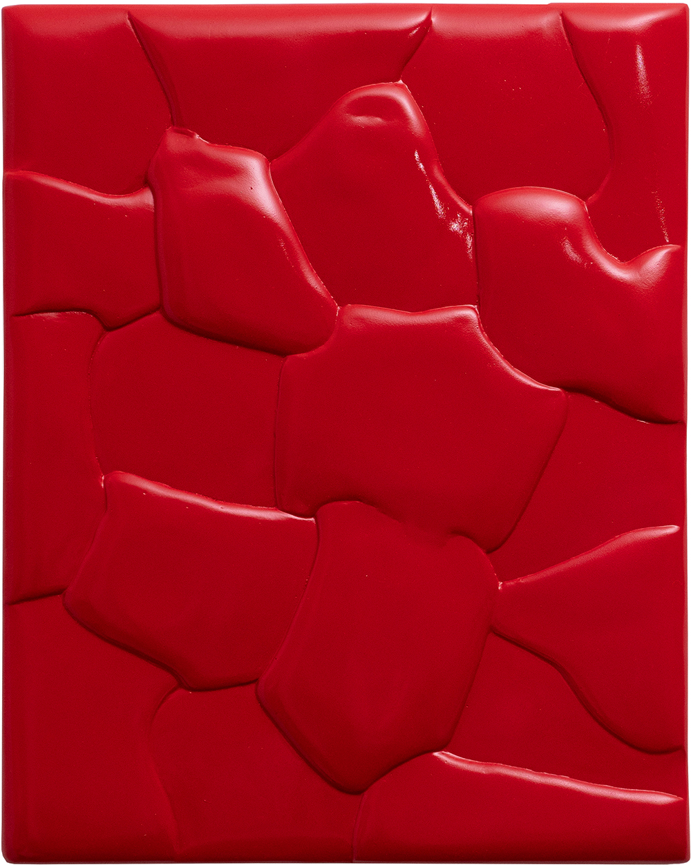 arancione attraversa la composizione, segno sottile di connessione e fragilità. Il rosso