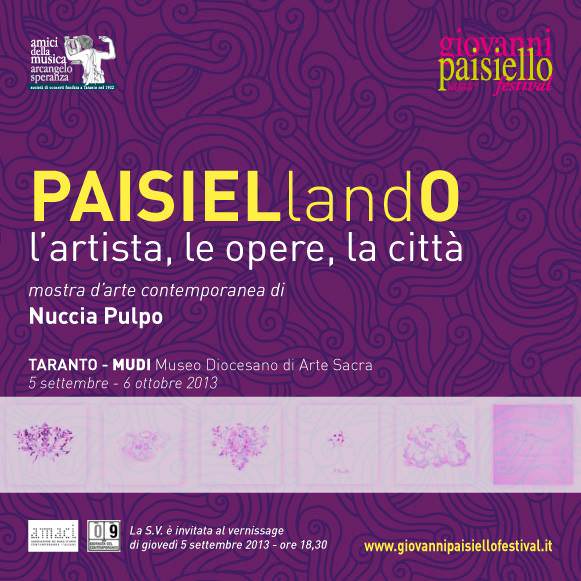 Si inaugura il 5 settembre alle ore 18.30 presso le sale espositive del MUDI - MUSEO DIOCESANO DI TARANTO la mostra dell'artista tarantina NUCCIA PULPO. La mostra rientra nel calendario degli eventi del FESTIVAL PAISIELLO che da 11 anni si svolge nella città di Taranto organizzato dall'Associazione Culturale e Musicale "amici della Musica" www.giovannipaisiellofestival.it