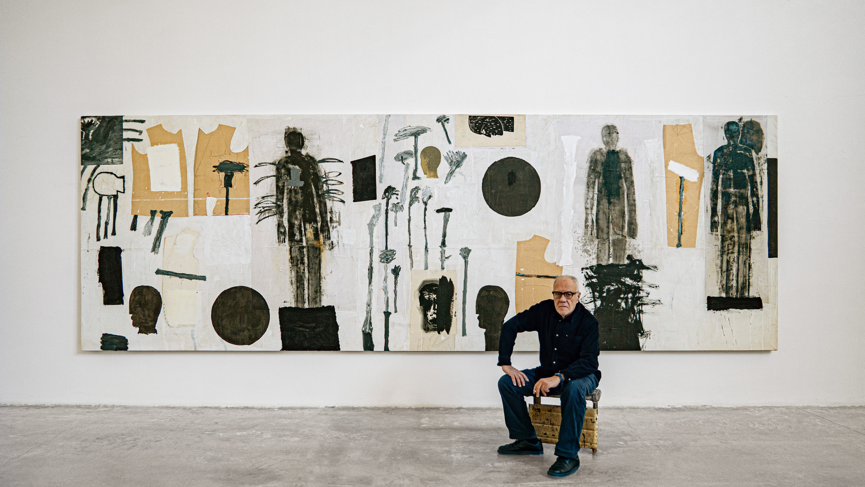 L’allestimento ruota attorno all’imponente opera su fondo chiaro, Treno, 2022, (tecnica mista su tela, cm.h. 200 x 600) sulla quale è dipinta a colori scuri una sequenza di sagome e figure archetipiche, cifra tipica del linguaggio dell’artista.
