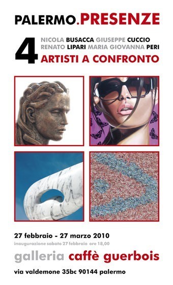 Palermo. Il 27 febbraio 2010, alle ore 18,00, presso la Galleria d'Arte Caffè Guerbois (Via Valdemone 35 BC) si inaugura la mostra "Palermo.Presenze - 4 Artisti a confronto. In mostra opere di Nicola Busacca, Giuseppe Cuccio, Renato Lipari, Maria Giovanna Peri. Quattro artisti capaci di offrire un panorama di ricerche complesse e variegate, che si intrecciano in un serrato confronto attraverso stili e tecniche differenti. Nicola Busacca lavora metalli e marmi piegandoli al volere della mano, per rivelare forme di fluttuante vitalità, secondo un percorso astratto e concettuale di estrema coerenza. Renato Lipari pratica una "pittura" composta da un complesso di significati di alto profilo: il materiale utilizzato (euro triturati) prende aspetti di volta in volta diversi, a seconda che siano guidati da una volontà di conquista formale astratta oppure da una vocazione gestuale a significare altro. Giuseppe Cuccio rimane fedele alla figurazione classica, in cui l'amornia delle forme è il frutto di una sapienza scultorea acquisita attraverso lo studio dei grandi maestri. Maria Giovanna Peri, infine, è pittrice informata e intelligente: la sua pittura è un flash sulla quotidianità, dove è possibile rispecchiarsi e riflettere. Risultati visivi dissimili e risvolti emozionali diametralmente opposti si rivelano attraverso opere originali e raffinate, dando la misura delle potenzialità del linguaggio artistico moderno e contemporaneo.