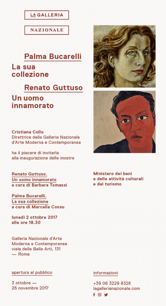 Palma Bucarelli. La sua collezione, a vent’anni dal lascito al museo avvenuto nel 1998 da parte della storica Soprintendente e Direttrice della Galleria Nazionale d’Arte Moderna (1941-1976), presenta in mostra una selezione delle oltre 50 opere che hanno fatto parte della collezione. Si va da Hans Richter del 1917-18 e Henry Moore del 1931, alla figurazione italiana degli anni ’30-’40 con Arturo Martini, Marino Mazzacurati, Alberto Savinio, oltre a un nucleo di grafiche e acquerelli di Giorgio Morandi, per approdare nel dopoguerra all’Astrattismo di Prampolini e di alcuni ex giovani di Forma 1: Piero Dorazio, Pietro Consagra, Giulio Turcato. A rappresentare gli stranieri sono invece Masson, Tàpies, Hartung e Twombly, di cui nel ’58 Bucarelli presentò la prima personale romana alla Tartaruga. Di particolare rilievo è il nucleo di opere di Jean Fautrier.