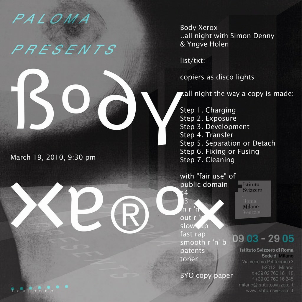 Body Xerox nasce da un’idea degli artisti Simon Denny e Yngve Holen, invitati dai quattro componenti del collettivo Paloma Presents, di base a Zurigo, a sviluppare un progetto durante la loro residenza nella sede milanese dell’ISR (fino al 29 maggio 2010).