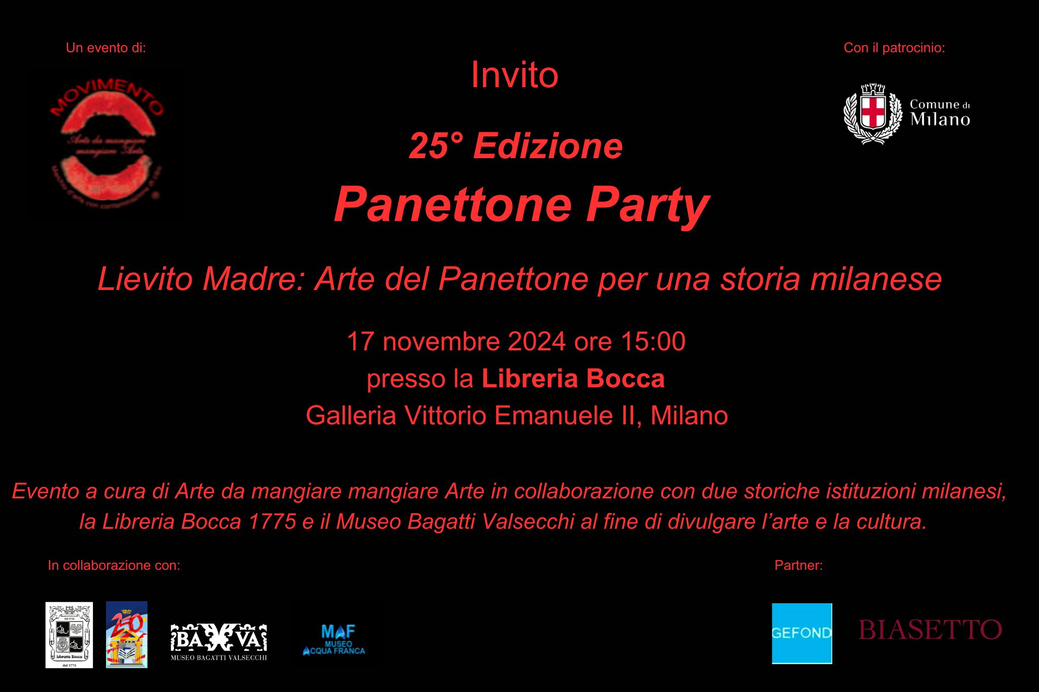 Quest’anno per la sua 25 edizione il Panettone Party si avvale della collaborazione di due celebri realtà milanesi: La Libreria Bocca e il Museo Bagatti Valsecchi. I libri d’artista in mostra saranno acquistabili presso la Libreria Bocca e il ricavato sarà devoluto al progetto “Illumina il Museo”, la raccolta fondi ideata da Giorgio Lodetti per sostenere il restauro dell’impianto di illuminazione del Museo Bagatti Valsecchi. Inoltre, una giuria di qualità del museo selezionerà alcuni dei libri in mostra per l’asta dedicata che si terrà il 10 dicembre presso il Museo BaVa, così da contribuire ulteriormente alla campagna “Illumina il Museo”.