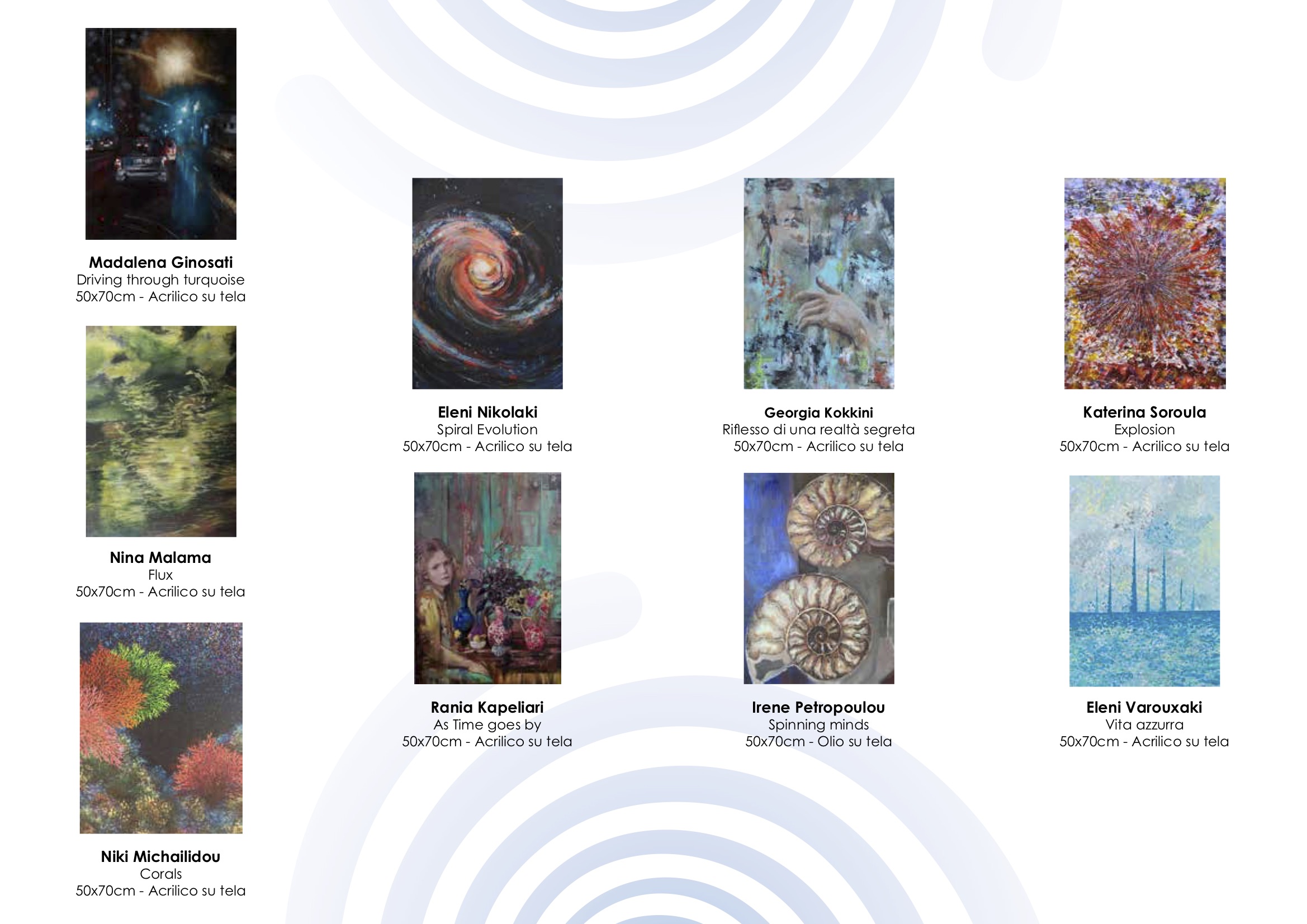 Tema portante e che conferisce il titolo alla mostra è “Panta Rei” il concetto filosofico greco per cui tutto scorre nell’inevitabile divenire, le artiste ci presentano nove diverse visioni del tema, declinato in tutte le sue sfaccettature.