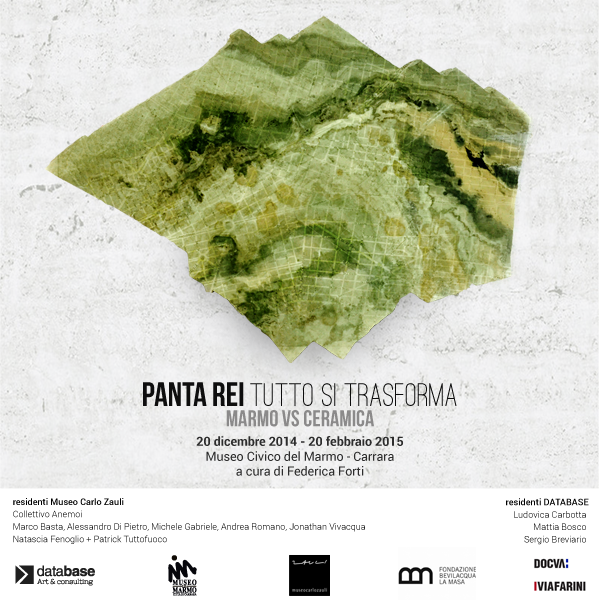 Questa è la riflessione da cui parte Federica Forti – direttrice artistica di DATABASE e curatrice di Panta Rei. Tutto si trasforma, una mostra di sculture in marmo e ceramica dal 20 dicembre 2014 al 20 febbraio 2015 presso il Museo Civico del Marmo di Carrara. L'allestimento apre un dialogo tra la collezione permanente del Museo Civico del Marmo di Carrara, i progetti specificamente realizzati dagli artisti in residenza di DATABASE 2014 e le opere in prestito dal Museo Carlo Zauli di Faenza, realizzate in occasione della Residenza d’Artista edizione 2014 – ceramica nell’arte contemporanea, in collaborazione con DOCVA Via Farini (Milano) e Fondazione Bevilacqua La Masa (Venezia), sotto la direzione di Matteo Zauli.