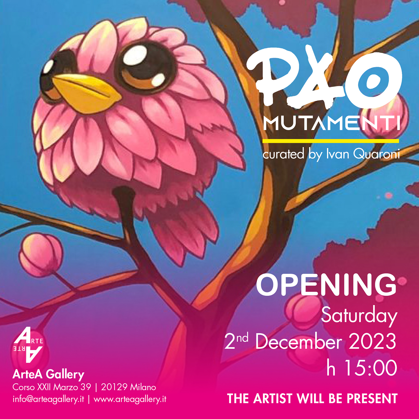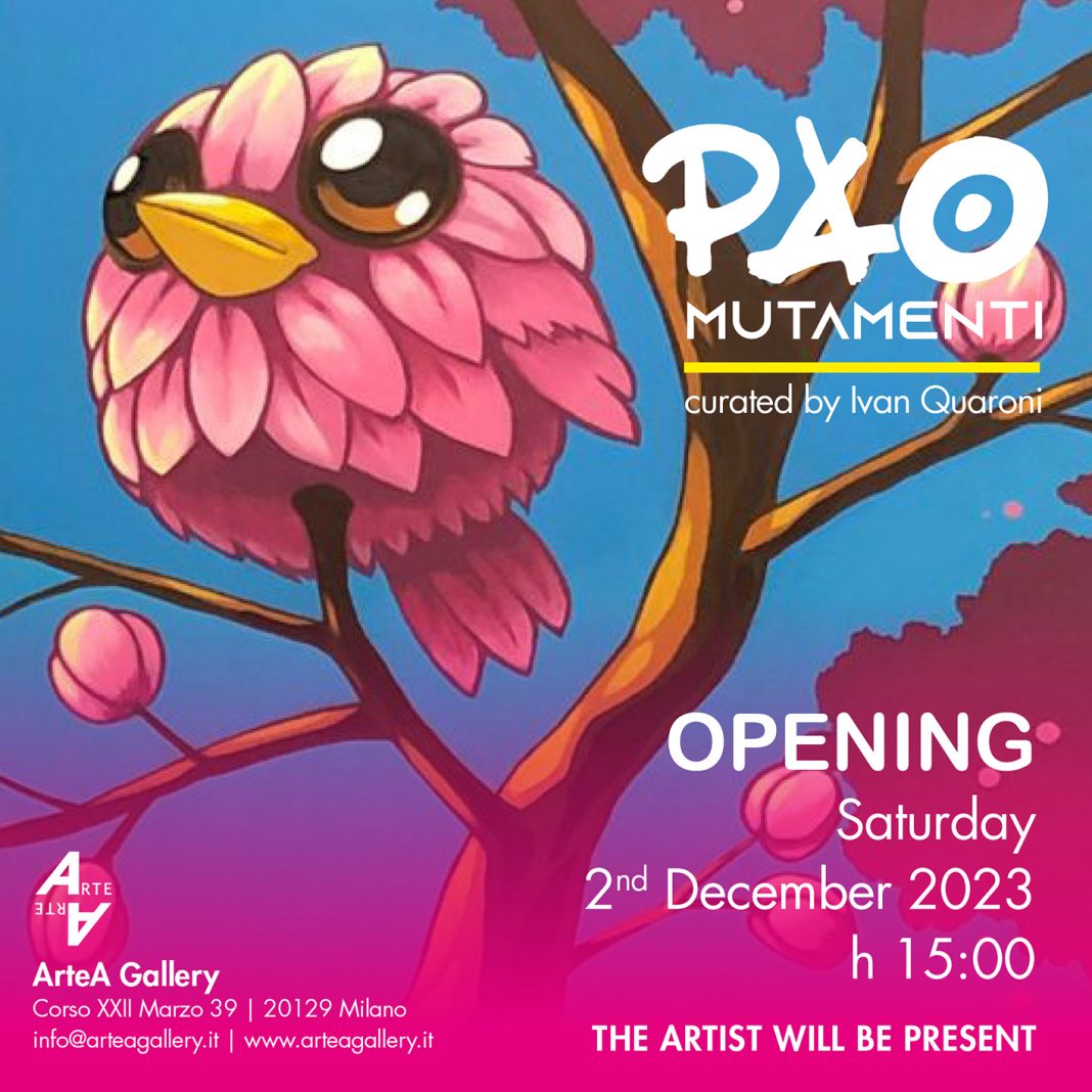 “Mutamenti”, questo il titolo della nuova mostra personale dell’artista, che torna ad esporre alla galleria Arte A, a distanza di otto anni da “Black Hole Fun” (2015), presenta quindici opere inedite, molte delle quali realizzate tra la primavera e l’autunno del 2023. Sono lavori in cui compaiono nuovi personaggi che arricchiscono il bestiario di Pao, introducendo una pletora di figure ambigue, generate da imprevedibili incroci tra il regno animale e quello vegetale, ma anche da impossibili innesti al confine tra mondo organico e inorganico.