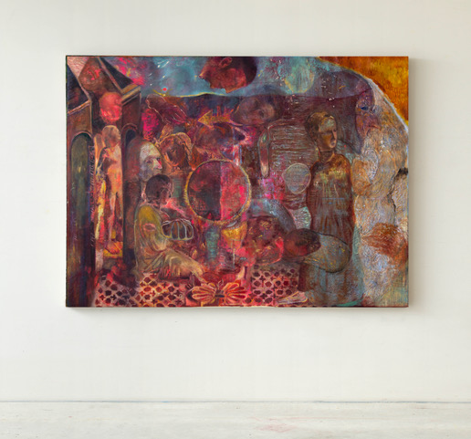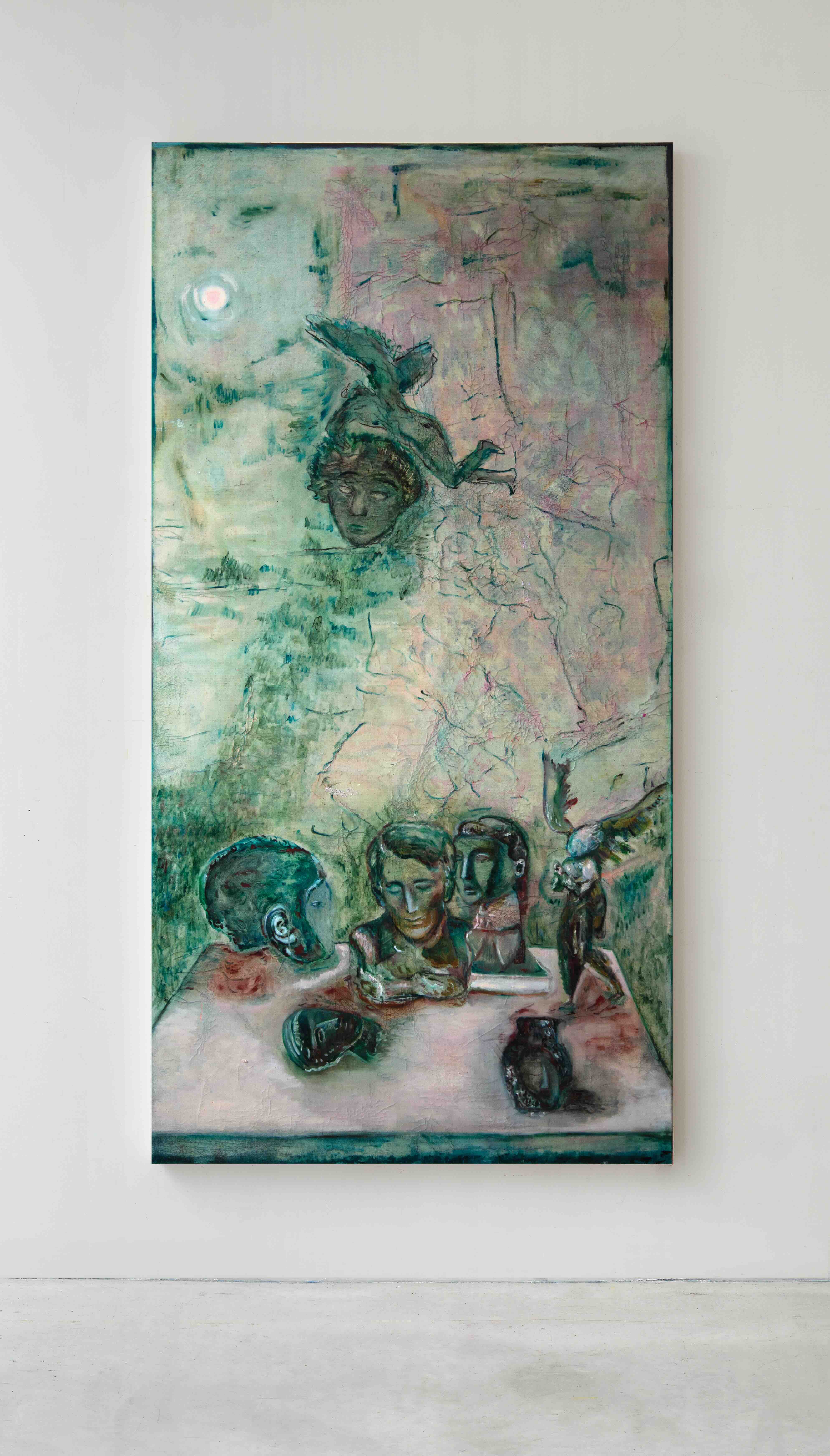 Nell’ultimo strato, la finitura, si dispongono cinque dipinti autoportanti di grande verticalità, corpi pittorici che restituiscono stratificazioni di memoria e mutamento. Ciascun quadro è diverso per costruzione, atmosfera e densità del segno: superfici irregolari, attraversate da sovrapposizioni di colori e grafismi, alternano zone luminose e presenze lunari in un dialogo serrato fra soggetti e paesaggi. La luna, insieme agli angeli e alle fratture della superficie, ritorna come guida e compagna di viaggio; non è solo elemento poetico, ma presenza che illumina la tensione tra desiderio di elevazione e peso della materia, come un’eco della lezione di Licini. In uno dei dipinti, dominato da verdi profondi e rosa accesi, un unico sguardo vigile emerge tra volti dagli occhi chiusi, mentre un angelo in volo tenta di trattenere una testa che il verde della natura sembra seguire come una scia; a terra, una sorta di zattera raccoglie tra i naufragi il volto di Leopardi, poeta caro sia a Licini che ad Angelini.