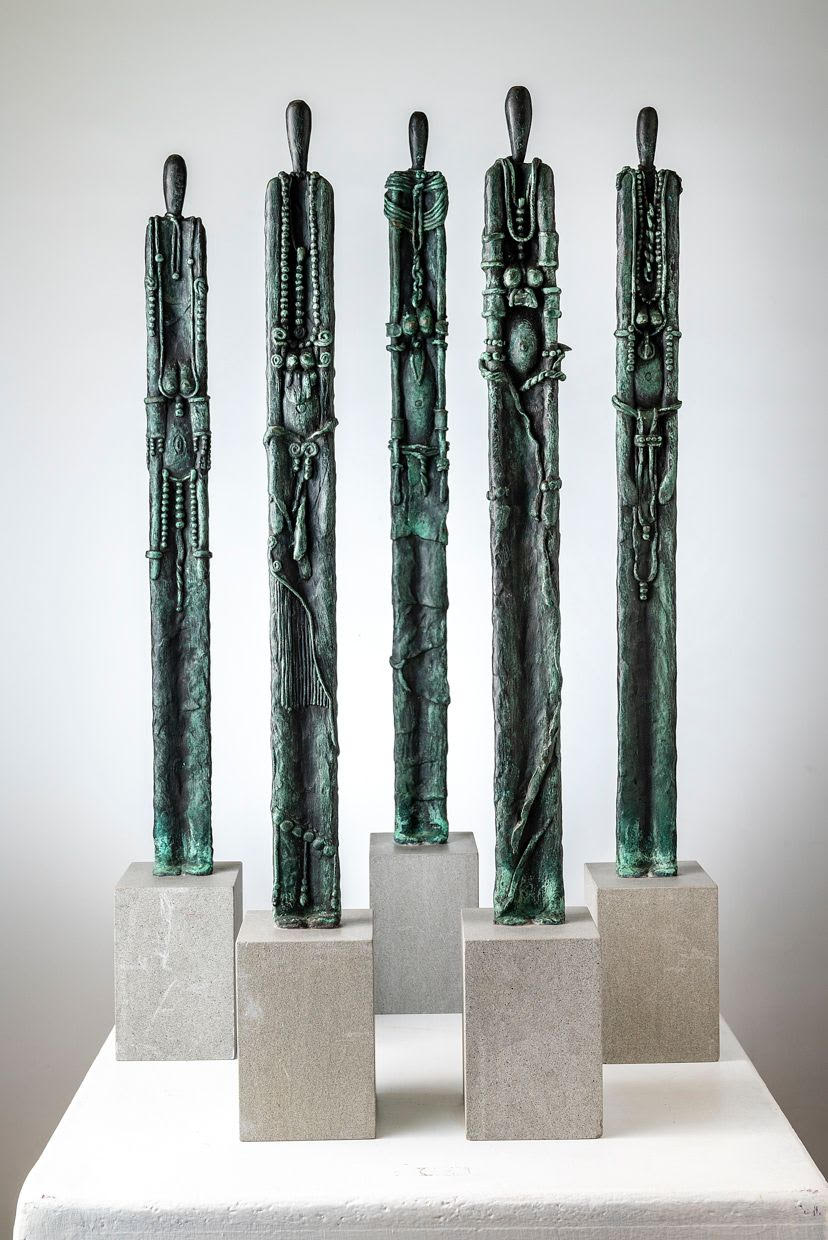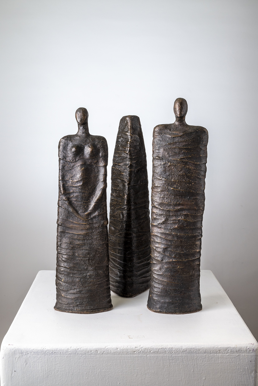 È un bosco di totem, che subito cattura lo sguardo: visitando lo studio di Paola, il primo lavoro su cui si sono posati i miei occhi è stato proprio questa foresta di figure colonnari, esili e salde al contempo. Osserviamo dunque con attenzione questo bosco di totem, poiché subito ci introduce ai temi dell’arte di Paola Angeloni: il totem, che è un idolo, è pure un’immagine dell’archetipo, concetto centrale nella sua produzione.