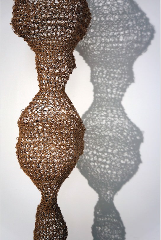 Paola Anzichè, Senza Titolo, 2018, carta e filo di ferro.Paola Anziché dice “mi piace vedere con le mani”: con questo intento riscatta dalla loro anonimità corda, juta, cartone, canne di bambù, tessuti, ceramica, e modifica il loro uso comune in sculture, installazioni. Non a caso la sua Vetrina s’intitola Materiali.
