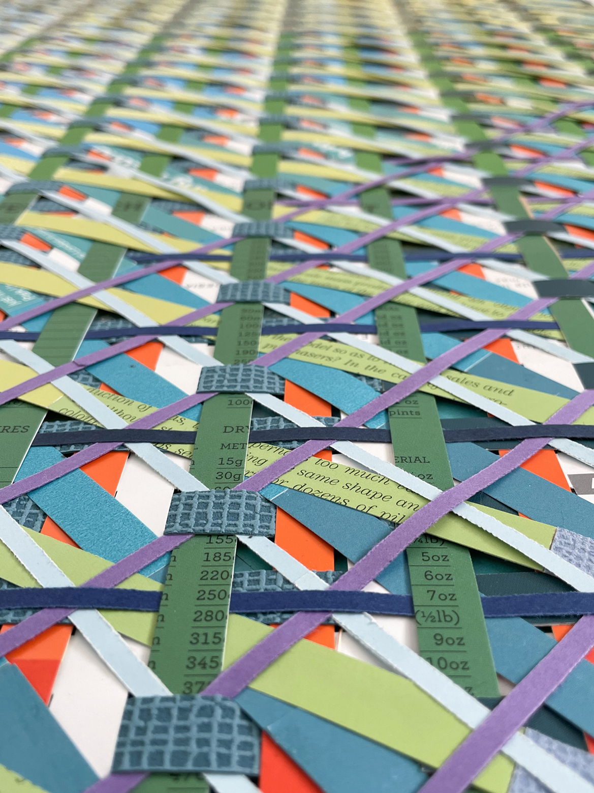 Con la tecnica giapponese del Kirigami l’artista ha creato le JelloBlooms, strutture leggere che ci introducono al suo più ampio lavoro realizzato con l’impiego di diverse tecniche, tutte eseguite pazientemente a mano. Dalla fase iniziale di progettazione, passa alla realizzazione secondo intrecci, sovrapposizioni e tessiture. Tutte metamorfosi di un materiale quasi sempre di recupero nobilitato in forme complesse e inaspettate.
