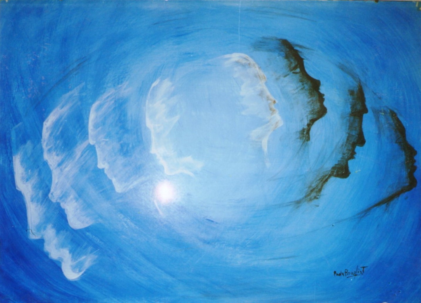 I temi affrontati da Paola Braglia Scarpa sono da tempo caratterizzati da uno spessore intensamente meditativo, che indaga l’uomo ed il significato profondo dell’esistenza. La ricerca sulla nascita del cosmo si è concretizzata in una serie di opere, interamente ritmate dall’espansione e contrazione armoniosa del colore, che già rivela la decisa tendenza alle tonalità azzurre. La presenza insistita del blu, variamente sfumato, si rivela essere la costante caratteristica che distingue la pittura cosmica di Paola Braglia Scarpa, anche quando vi emergono accenni di figure, come nelle nuvole fantastiche o nei cavalli che si librano leggeri nell’aria. Se la presenza di queste forme manifesta la sofferta esistenzialità, che si pone davanti all’indecifrabilità dell’enigma, documenta altresì la capacità di fondersi con l’energia vitale nella simbolica immensità del cielo, cui valgono lo sguardo o nel quale si immergono.