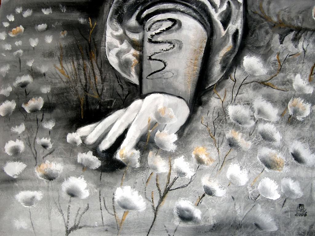 Nelle tempere acriliche su tela e tavola, appaiono figure dai contorni stilizzati ed essenziali che ci rimandano a soggetti della musica e del cinema.