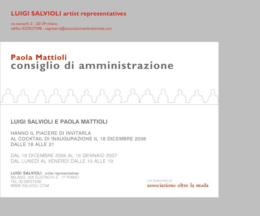 L'associazione oltre la moda presenta la mostra fotografica CdA: Consiglio d'Amministrazione di Paola Mattioli, che si inaugura il 18 dicembre alle 18:00 presso lo Spazio Luigi Salvioli, in via Eustachi, 2 - 1° piano, a Milano.