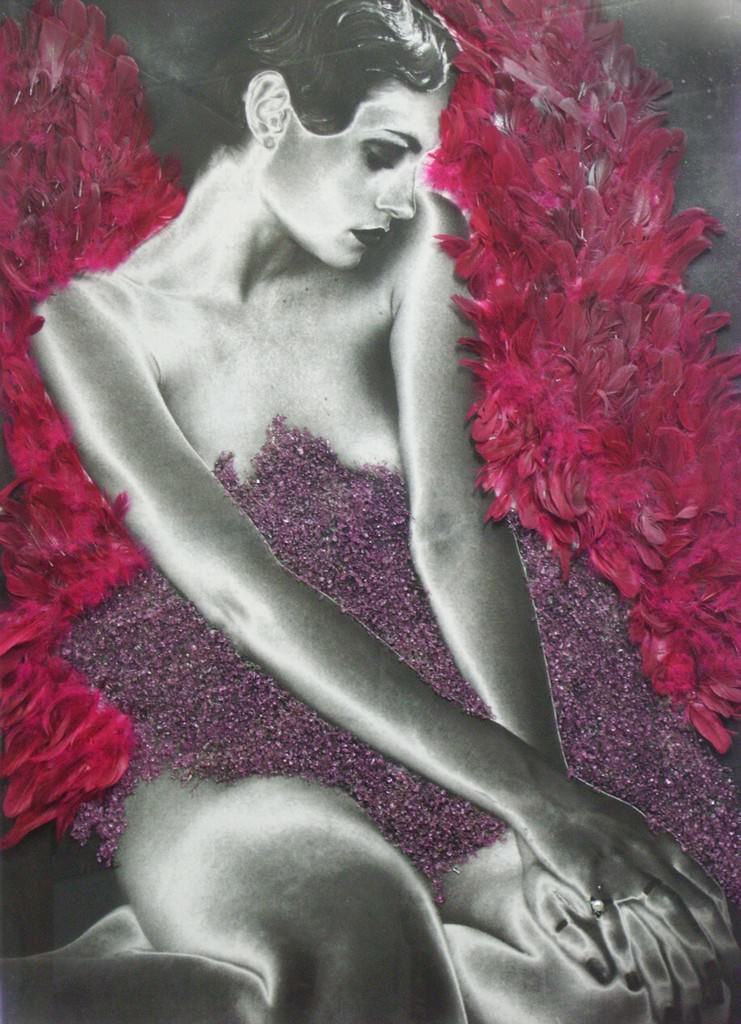 “Materia” elemento comune di questo lavoro di sinergia. Nonostante la sperimentazione digitale, la purezza fotografica dei bianchi e neri del dalla Chiesa mantiene una forte sensualità e romanticismo.Le fotoinstallazioni diventano opere pittoriche che con l’intervento volutamente sensoriale della Romano prendono una dimensione tridimensionale grazie all’inserimento di elementi come piume, perle, argento,oro e colore.