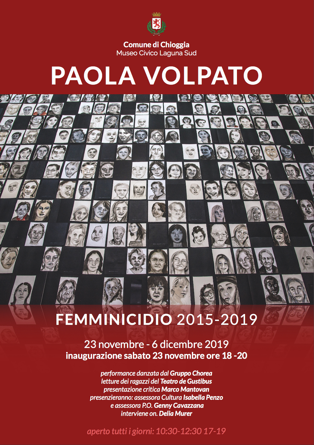 Paola Volpato prosegue questo lavoro artistico e civile di memoria che dal 2015 la vede ritrarre tutte le donne uccise per femminicidio in Italia. Opera potente ed antiretorica che si forma site specific e che a Chioggia sarà una video istallazione in una capovolta ed immersiva black-box