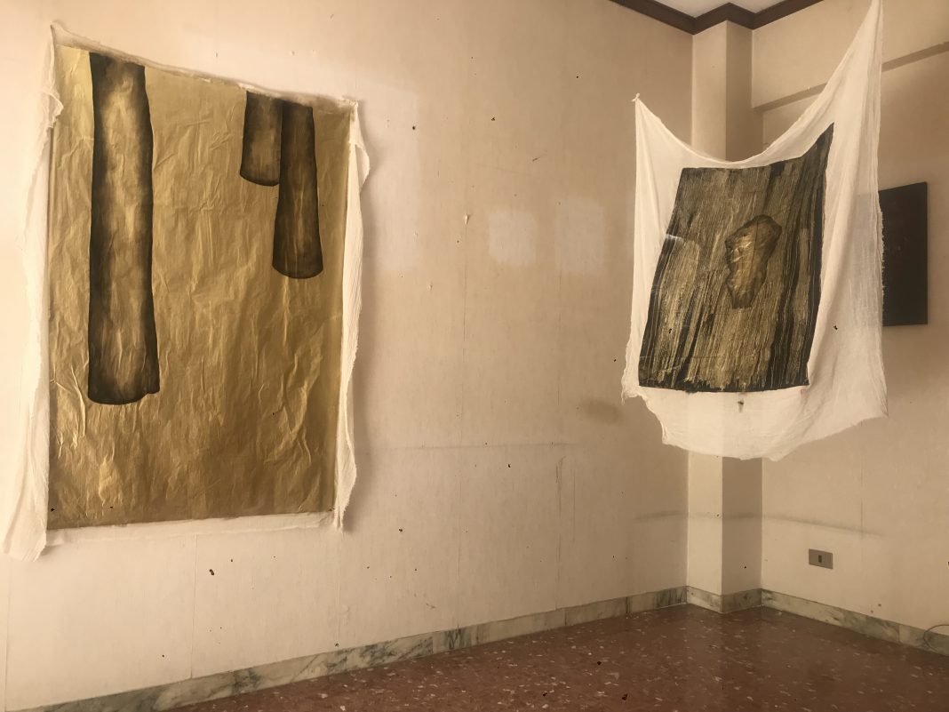 Nell’appartamento trasformato in spazio espositivo Paola Zampa inventa un bosco millenario scandito dalla tensione verticale di tronchi svettanti, tra i quali baluginano fantasmi e presenze divine. Immagini sospese nell’aria, simili a foglie agitate da un vento inquieto, accolgono i visitatori