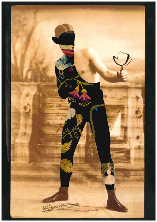 Cinquanta opere, collage che assemblano antiche fotografie, incisioni, disegni e stoffa, con estrema libertà espressiva e che rendono la lotta tra gli uomini un teatro di gesti e colori