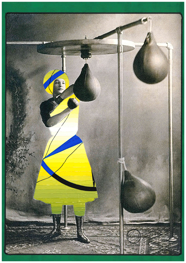 I collages con i pugili di Bielli iniziano nel 2017, sempre nel rapporto creativo con Enzo Mazzarella. Le immagini scelte dall'artista fanno parte di un repertorio di "anciens boxeurs", fotografati tra la fine dell'800 e la metà del '900. Sono immagini in qualche misura "archeologiche": gli interventi con inserti di colori le trasformano in scene leziose, nelle quali il cerchio, tracciato sull'immagine, rimanda alle antiche lezioni di Strazza.