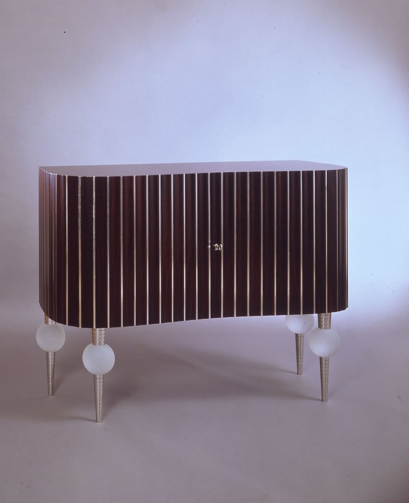 L’estro e lo slancio progettuale di Buffa - testimoniato da un disegno del 1945 - rivive oggi in un mobile bar unico e sorprendente, animato dalla luce che si posa su innumerevoli sfaccettature e l’intarsio di un ricco fogliame fiorito, disegnato da Giovanni Gariboldi, si materializza in un mobile tutto da scoprire nei colori, nelle geometrie, fin nella delicatezza delle soluzioni interne.