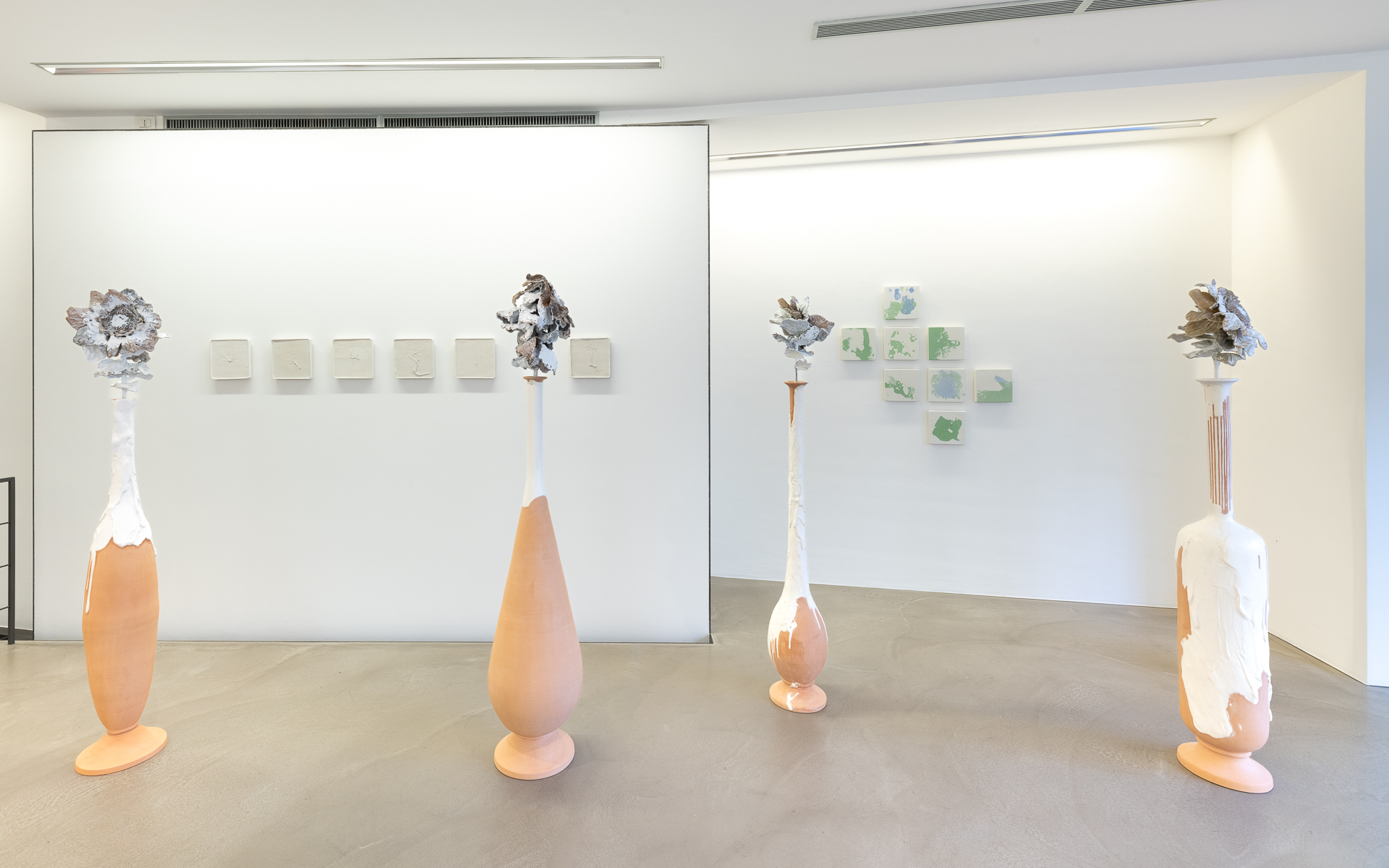 A determinare la vitalità espressiva di queste creazioni sono i vasi forgiati in terracotta, dalla forma sempre unica e diversa che si impone e disegna lo spazio circostante in un gioco di rimandi mentre il colore bianco, luminoso e materico, accende i toni bruniti della ceramica.