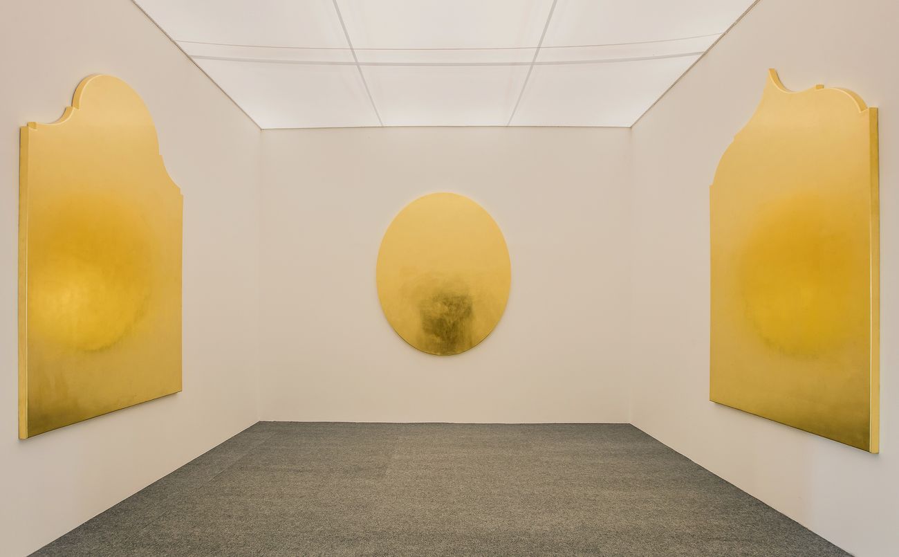 I Golden Works esposti in BUILDINGBOX fanno parte del ciclo Monumenti della Memoria, iniziato dall'artista tra il 2011 e il 2012 per rispondere in maniera radicale all'inquinamento visivo quotidiano a cui è sottoposto anche il territorio dell’arte. In questi monocromi oro, Canevari si allontana da qualsiasi autocompiacimento, affidando a un artigiano la lavorazione manuale a foglia oro, tecnica antichissima usata sia in Europa, sia in Asia. Le silhouette di questi lavori richiamano le antiche pale d'altare in cui però non viene rappresentata nessuna storia di santi, nessuna parabola, lo sguardo non ha alcun appiglio tranne il lieve riflesso della nostra stessa immagine; sembra quasi un’eco pittorica, il ricordo del quadro.