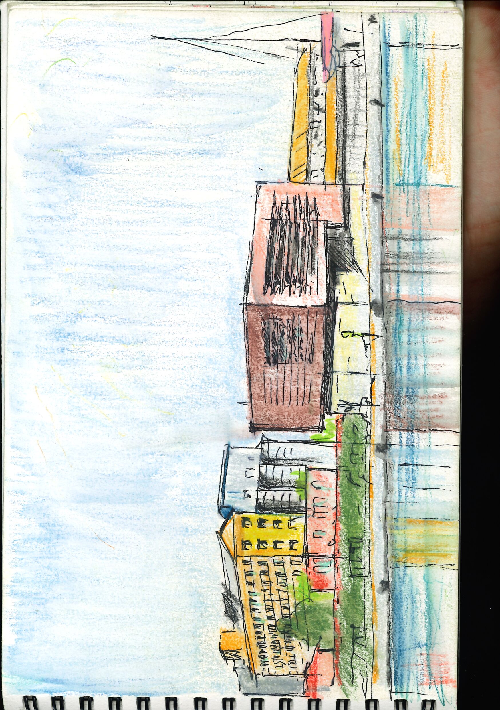 Le “mezze ore” sue, volte a delineare gli edifici che ne costituiscono il paesaggio antropico-naturale, come il palazzo condominiale a mosaico di Cino Zucchi, o quello dell’Autorità Portuale, o i pub e i locali che nel tempo hanno aperto riconvertendo vecchi magazzini dismessi, o altri colmi di fascinazione proprio perché in stato di abbandono, come il cosiddetto Sigarone insieme a ulteriori lacerti industriali, o gli oggetti mobili come la nave Lady Aziza e il Moro di Venezia, gli hanno suggerito, partendo da disegni di circa 15x20 cm, gli ingrandimenti su plexiglas (circa 50x80 cm) di questa esposizione, con stampe ora più lucide per restituire la liquidità marina e cromatica degli originali, ora più opache per i bianchi e neri delle piattaforme e dei pozzi di estrazione di idrocarburi.