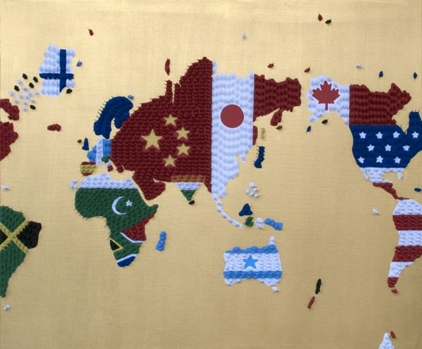 Si tratta di collage tridimensionali di piccole figure antropomorfe (soldatini in plastica) immerse in bagni di colore, poi disposte sulla tela massificate ed uniformate formando mappe geografiche, territori e bandiere.