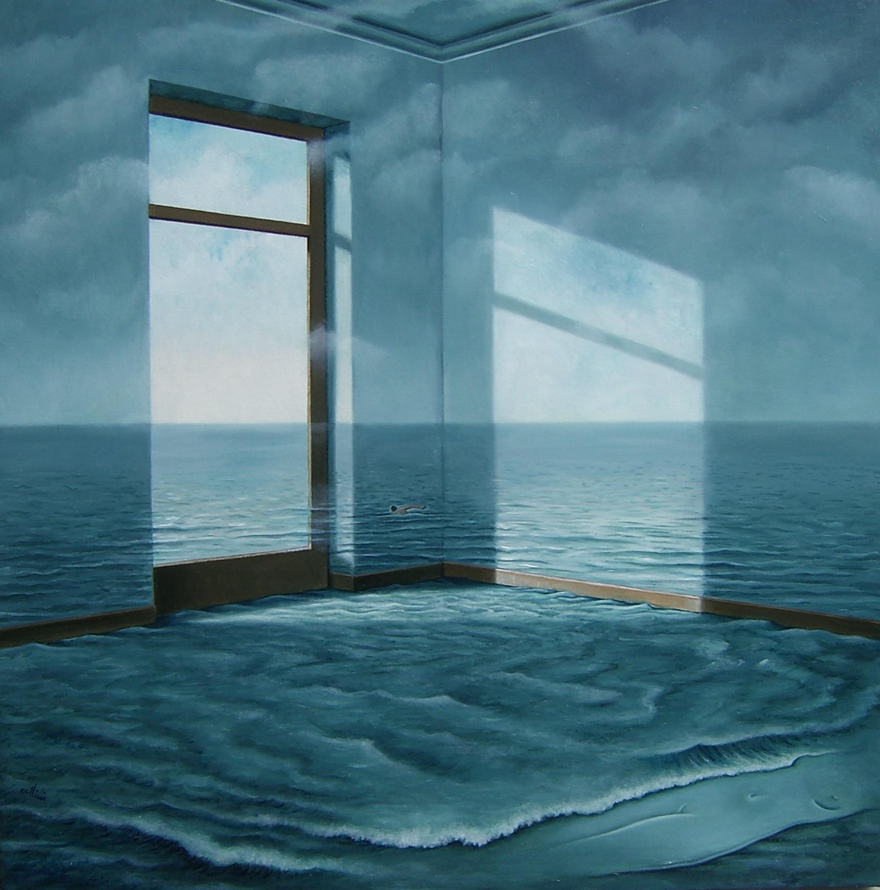 L’uomo che sorvola le nuvole di Collini non ha i poteri ultraumani di Nembo Kid, né il grave compito di Astolfo o l’ironica vanagloria di Karl Friedrich Hieronymus; è invece una creatura onirica, umana soluzione alla maledizione baudelairiana vaticinata ne L’albatros. È vero: il poeta (dal greco poiêtês, colui che crea) vola alto, si muove elegante in cielo e goffo sulla terra; ma sfido io! Non riesce facilmente ad adattarsi subito dalle atmosfere leggere al pondo gravitazionale. Così Collini, come un geniale illusionista, ha ideato un brillante espediente: chi vola non è nudo, né indossa un’azzurra tutina aderente, non conta su un ippogrifo, né su una palla di cannone. È un uomo come gli altri, veste di tutto punto, ha persino la cravatta (no, non gli dà noia, è come i capelli lunghi: al vento dà la piacevole sensazione del volo anche quando ci tormenta la faccia) e le scarpe, sì le scarpe, per quando dovrà atterrare sul ponte di una nave, sul tetto del mondo, o sull’Isola-che-non-c’è. Ecco forse il vero senso della pittura cilestre di Collini: non l’evasione fantastica ma la consapevolezza della magia che pervade il reale, tutto. Franz Roh avrebbe riconosciuto in Collini gli elementi propri di quel Realismo Magico che non si riconosce nell’accademismo, né tanto meno nell’avanguardismo fine a se stesso.