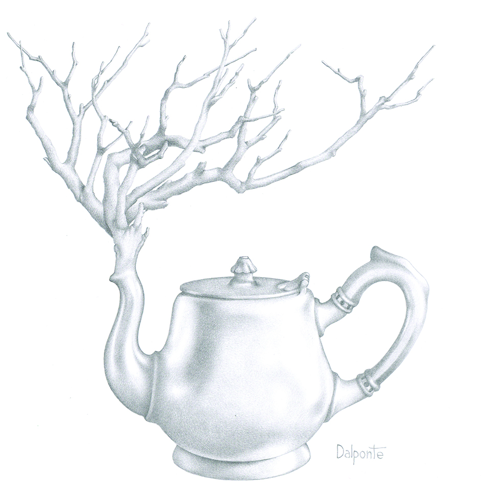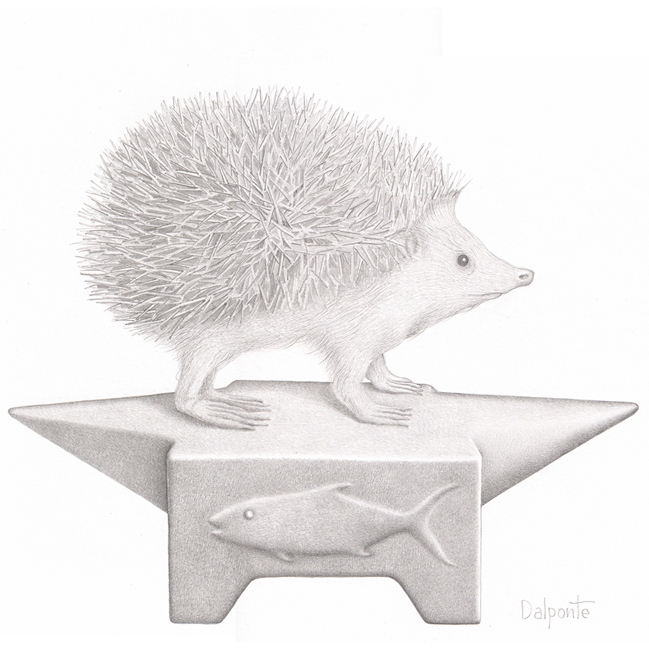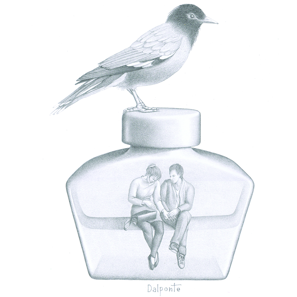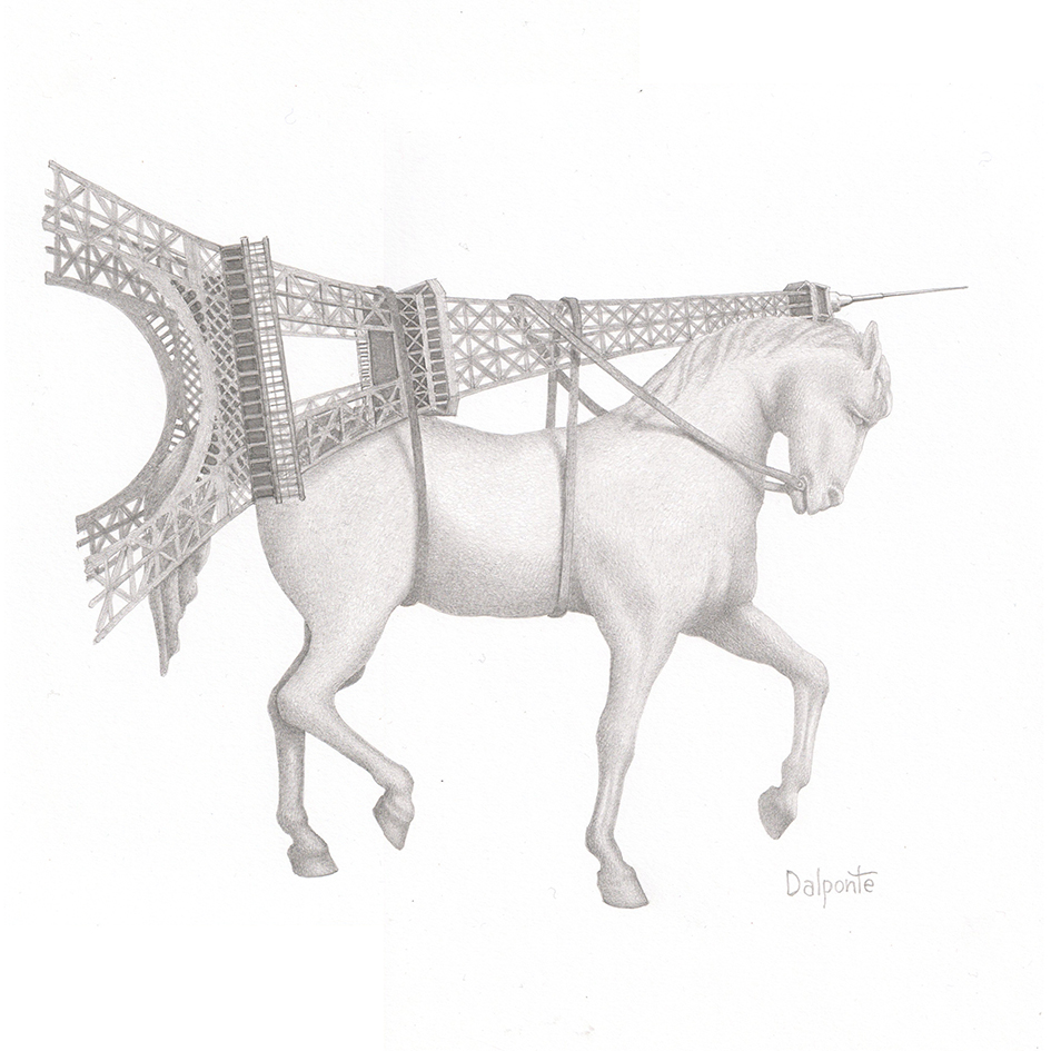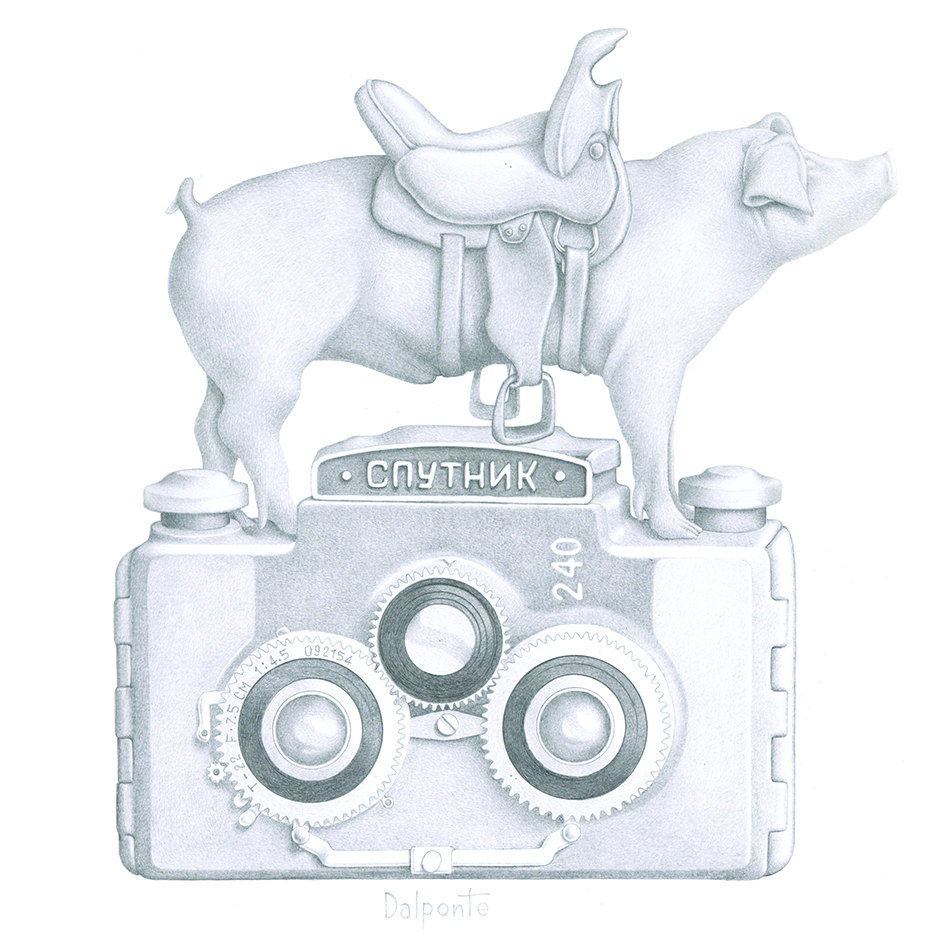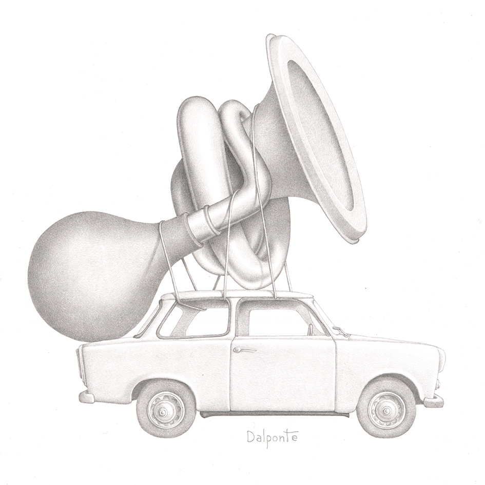 Quello che contraddistingue i lavori di Paolo Dalponte, però, non è il ricorrere all’elemento fantastico o a atmosfere metafisiche; la sua invenzione fruga nel presente, a volte utilizza frammenti del passato, ma sempre in modo ingordo, con incontenibile capacità di abbinare cose, oggetti, anche animali, che dalla matita escono freschi ed ignari, seppur nella loro complessità, nella loro potenzialità assurda. In origine ogni singolo frammento possiede una propria storia, una collocazione logica sugli scaffali del nostro cosmo noto, un’identità che, però, è solo uno spunto per Dalponte, un guizzo onirico per avviare una nuova dimensione del manufatto in tutto diversa dalla realtà.