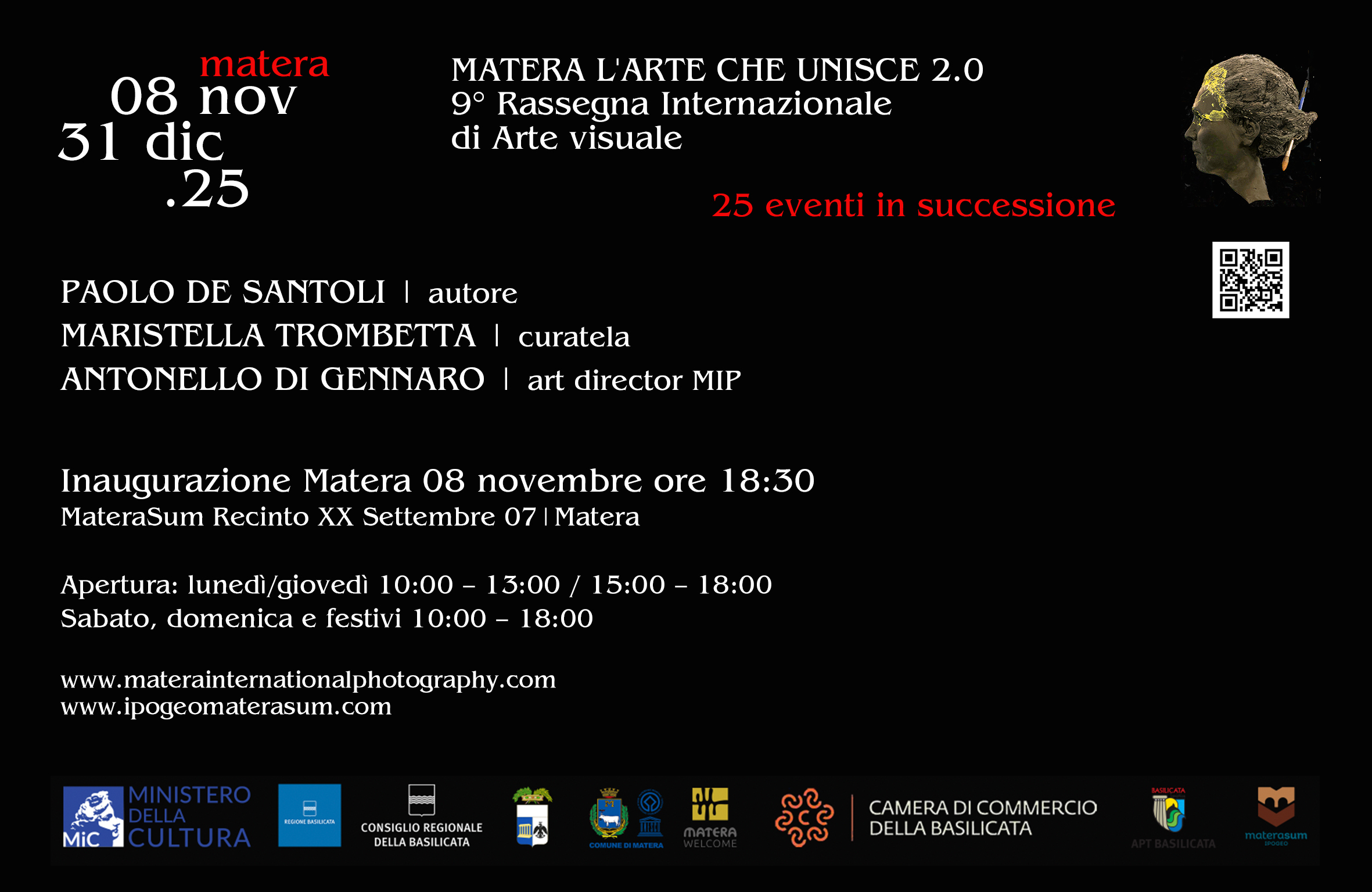 Sabato 8 novembre 2025, alle ore 18.30, si terrà presso MateraSum Ipogei l’inaugurazione del progetto espositivo “Facies”, promosso dal MIP – Matera International Photography APS-ETS, in collaborazione con Antonella Caruso, nell’ambito della 9ª rassegna internazionale di arte visiva “Matera l’Arte che Unisce 2.0”.