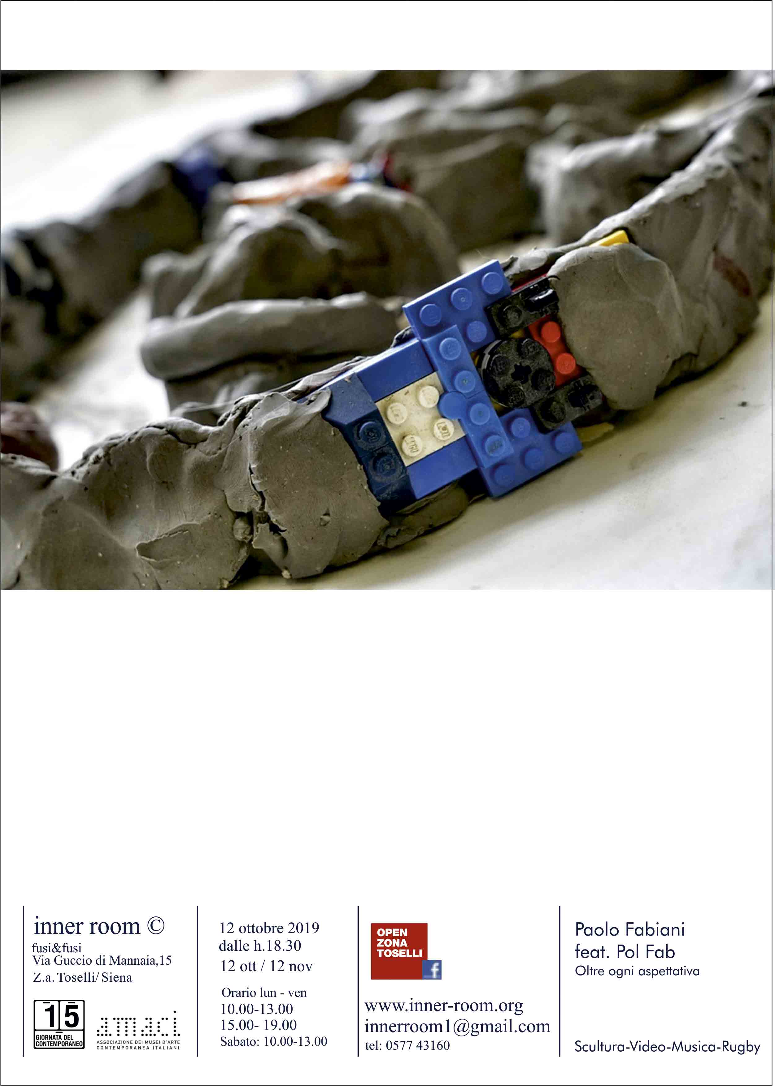La mostra si compone di tre momenti che ruotano intorno all’azione TLODMTVAS condotta insieme alla squadra di rugby dei Banditi, Siena sul tema del team building sullo sfondo della tragedia della migrazione. Fabiani da sempre svolge l’attività di pedagogo e di recente sociale.
