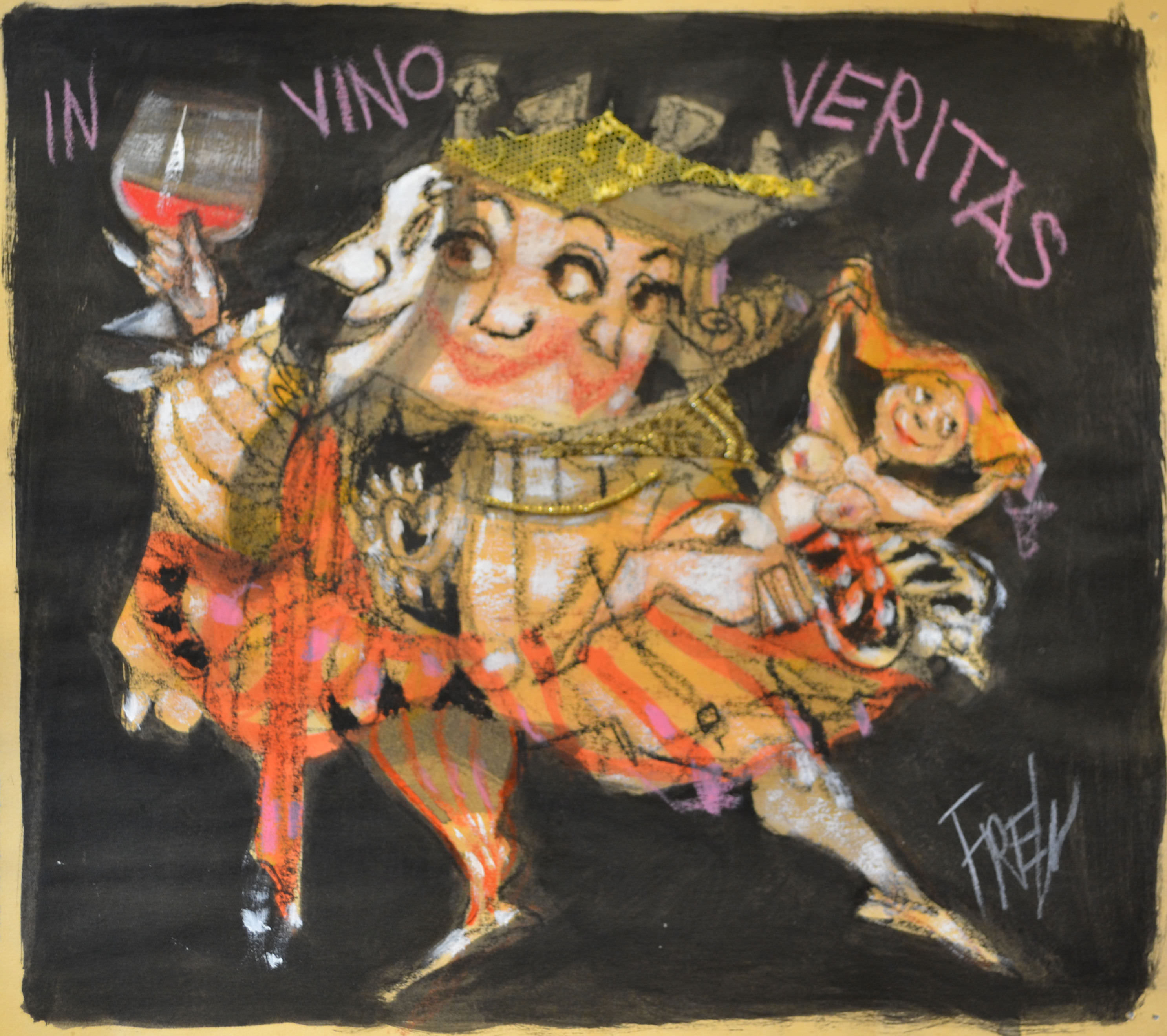 delibato nei giusti bicchieri panciutelli. L’ironia di Paolo Fresu, il suo gusto per il grottesco simpatico, trabocca nelle splendide carte dedicate al “divino liquore”, in cui gli stessi vini si trasformano in personaggi fantastici, dalle vesti sontuose, in un’allegoria barocca e insieme travolgente […] In vino veritas, recita il titolo della mostra di Paolo Fresu, e in effetti, come si ascolta in una celebre canzone popolare lombarda, «è l’acqua sì che fa male/ il vino fa cantar», regalandoci una sorta di febbre, uno scatenamento endorfinico capace di farci fare immediata pace col mondo, gli avversari e gli invidiosi, renderci loquaci e seduttivi, ma financo tristi e musoni, perché l’ebbrezza non sempre è allegra”.