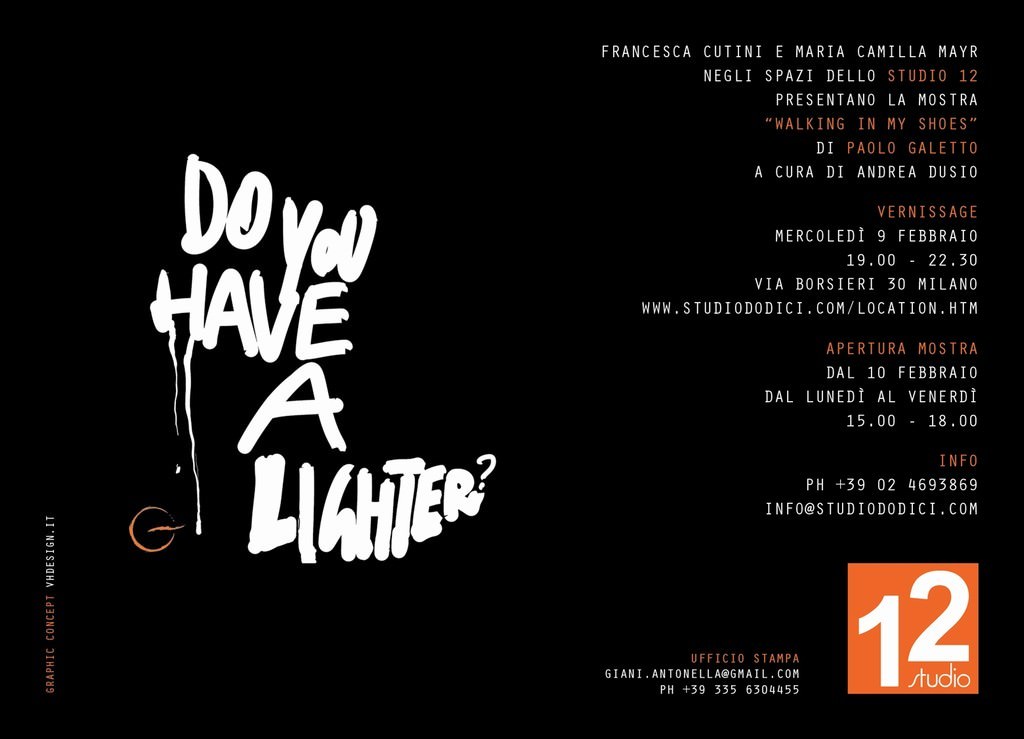 La vernice di “Walking in my shoes” si svolgerà mercoledì 9 febbraio, dalle 19.00 alle 22.30, a Milano in via Borsieri 30 (http://www.studiododici.com/location.htm), con la performance “Do you have a lighter?”. La mostra sarà poi visitabile a partire dal 10 febbraio, dal lunedì al venerdì, dalle 15.00 alle 18.00.