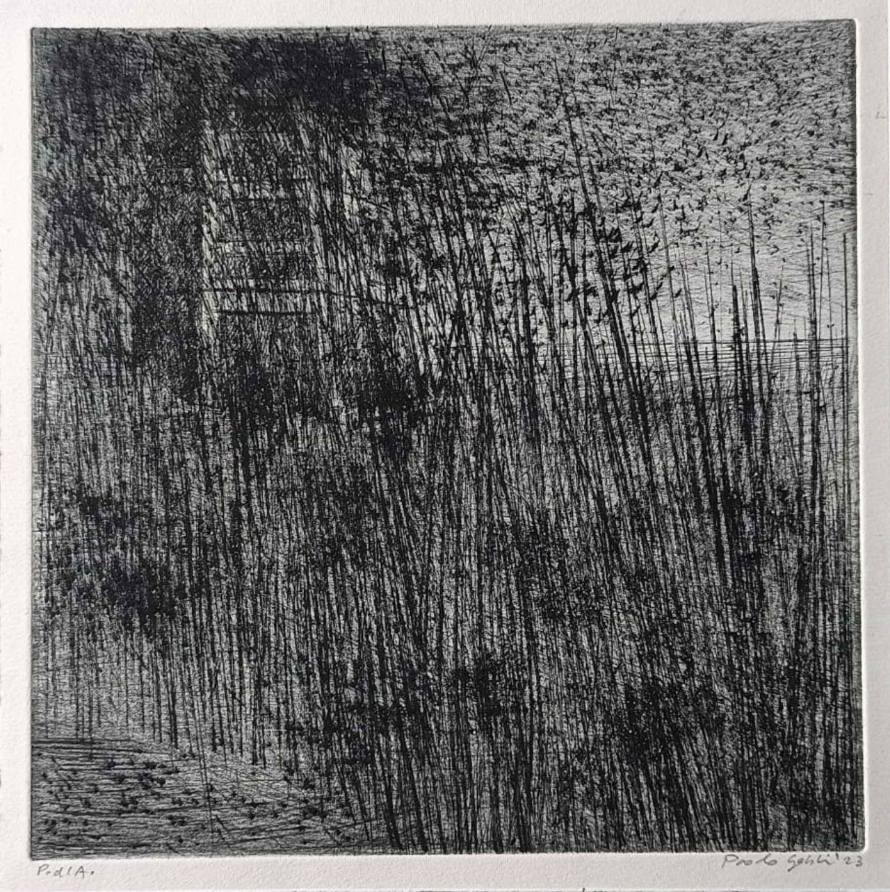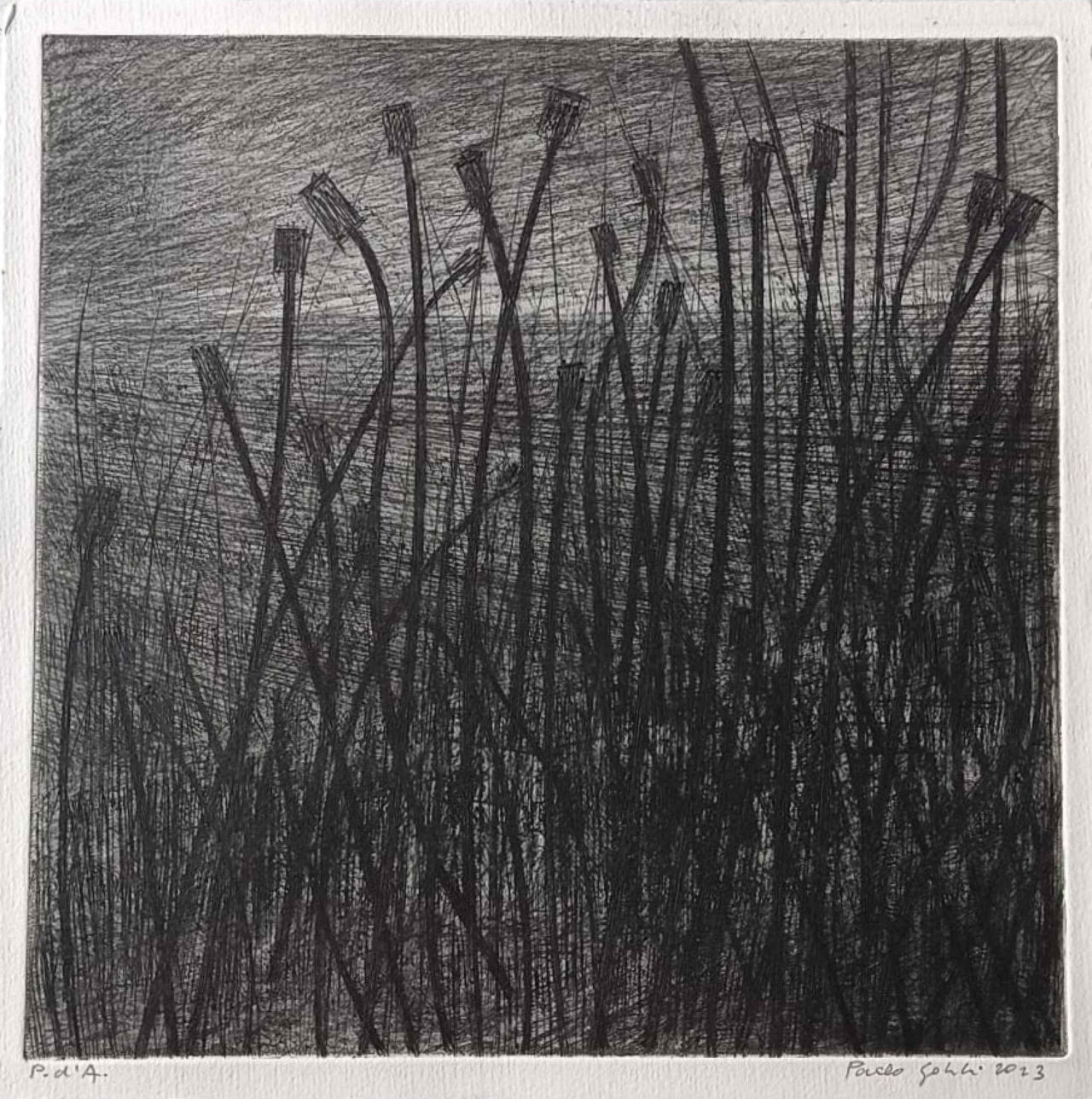 Paolo Gobbi con dodici incisioni a punta secca di piccole dimensioni (25x 25 cm) apre le stanze di una narrazione fatta di visioni e paesaggi immaginari ftti di segni in bilico tra fgurazione e astrazione.