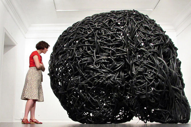 “Ciò che resta” è il titolo dell’ultimo grande lavoro di Paolo Grassino: un gigantesco cranio, realizzato in tubo corrugato e ferro. L’idea del “memento mori” sembra percorrere tutta la nuova mostra da Eduardo Secci, anche se le altre opere paiono non avere diretti riferimenti all’allegoria sulla morte, che è una delle costanti dell’arte occidentale da duemila anni a questa parte. Di fatto, si tratta di residui di fusione, di concrezioni metalliche, di “ciò che resta”, appunto, una volta che “ciò che conta” se n’è andato…