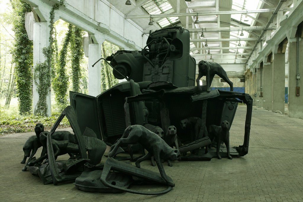 L’installazione, ospitata nella hall della sede di Patrizia Pepe, consiste in una grande scultura di un’automobile nera abitata da un branco di cani neri privi di bocca e orecchie