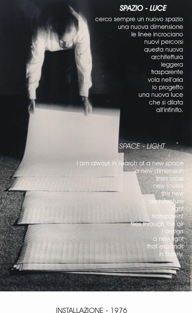 La carta resta il medium univoco, a mezzo del quale elaborare la sua ricerca sulla luce-colore e sullo spazio-luce: all’inizio era il cartoncino bianco, compatto, morbido, sul quale l’incisione, abbastanza profonda e la piegatura manuale lungo il segno, provocavano, con l’incidenza radente della luce, ombre più spesse e linee molto nette, evidenzianti il nucleo geometrico, il ‘gioco ottico’, che tendeva a dilatare nello spazio visibile, costituito dalla distanza tra il fruitore e l’opera, il segno-colore (si ricordi che nel manifesto della pittura futurista del 1910 si poteva leggere: ‘Allora tutti si accorgeranno che sotto la nostra epidermide non serpeggia il bruno, ma che vi splende il giallo, che il rosso vi fiammeggia, e che il verde, l’azzurro e il violetto vi danzano voluttuosi e carezzevoli !).
