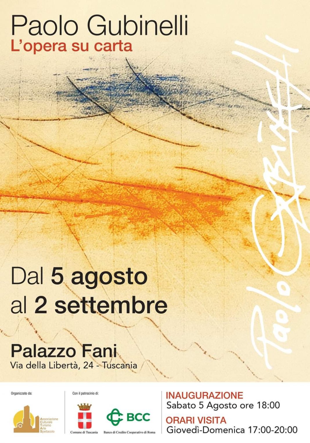 Si terrà sabato 5 Agosto, alle ore 18,00 presso Palazzo Fani, in Tuscania, l’inaugurazione della personale di pittura OPERE SU CARTA dell’artista, marchigiano e fiorentino d’adozione, Paolo Gubinelli.