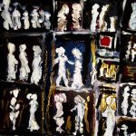 Intorno libri, un Novecento vivisezionato in rosso e nero, gli stessi colori che affondano nelle tele, che inchiodano in reticolati drastici ogni possibile conciliazione. E magari le sue teche dipinte sono librerie dell’anima, simili a quei piccoli scaffali della memoria dove i vecchi pescatori raccoglievano i souvenir portati dal mare.