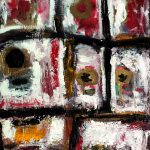 Intanto, oltre quei vetri, nella casa di Paolo, l’orologio dell’arte disattende i suoi appuntamenti con la vita e il Nostro artista, puntuale con la storia, finalmente decide di perdere alcuni treni. Dipinge, stratifica, spruzza, applica dorature acriliche, compone “acrostici indolenti”, respira solventi.