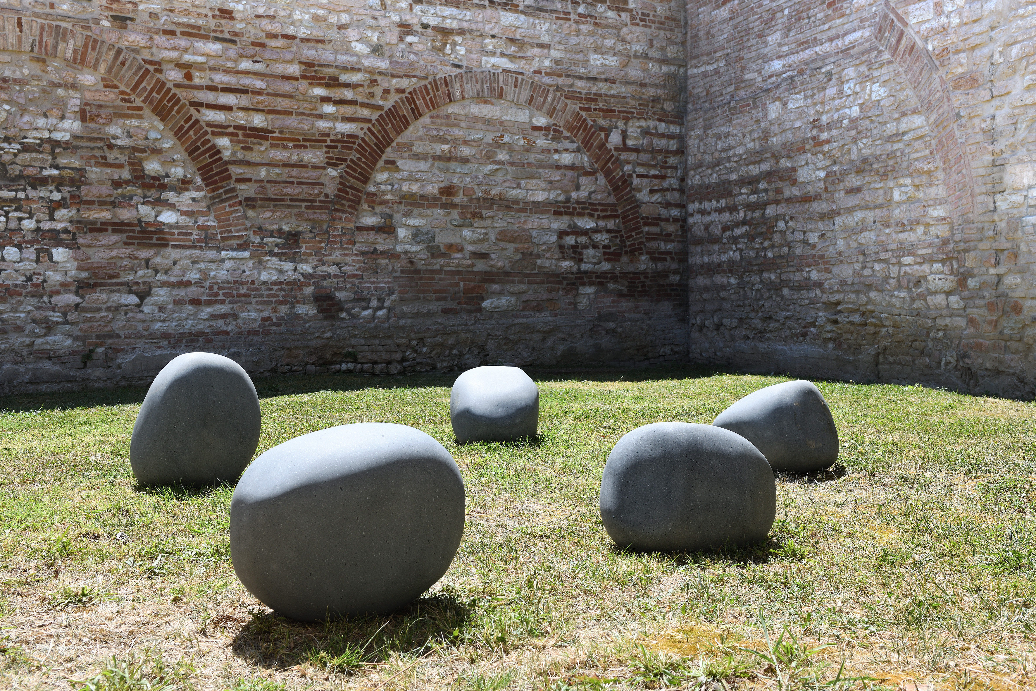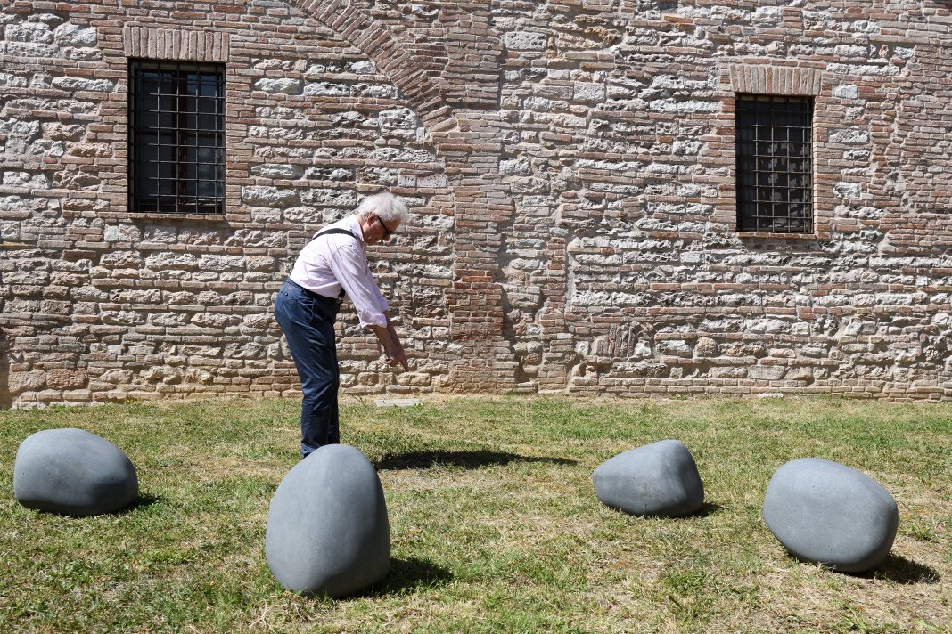 L’installazione è composta da cinque massi in pietra, semplicemente adagiati a terra. Quello che potrebbe sembrare un elemento naturale inserito nello spazio “artificiale” di un museo, è in realtà il risultato di un complesso processo creativo. Lo scultore ha inizialmente modellato in argilla una pietra “ideale”, levigandola fino a farla sembrare un sasso perfetto, come se fosse stato plasmato dall’acqua di un torrente. Da questa forma originale sono stati creati cinque esemplari in gesso, poi in cemento, e infine, grazie a una scansione 3D, sono stati scolpiti in pietra di Matraia, un materiale di color grigio-azzurro dall’eccezionale compattezza e resistenza. Pur avendo la stessa forma, i cinque massi appaiono diversi in quanto posti in cinque posizioni differenti, le uniche in cui stanno in equilibrio.