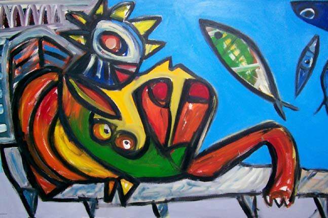 In questa mostra il pittore Paolo Lorenzo Parisi espone le sue “donne al mare” con la loro solarità virtuale e pseudo-balneare, ed inevitabilmente si sono colorate. Infatti, rispetto a suoi lavori precedenti, la gamma cromatica si è estesa, è diventata vivace, si sovrappone a strutture calibrate con accostamenti laceranti; tra i rossi puri e intensi che distinguono la pittura di questo Artista, il suo linguaggio cromatico esprime un incontenibile senso di violenza, non c’è pausa che non riveli l’intimo fermento che con passione indaga il mondo dell’istinto, dell’irrazionale, del surreale.