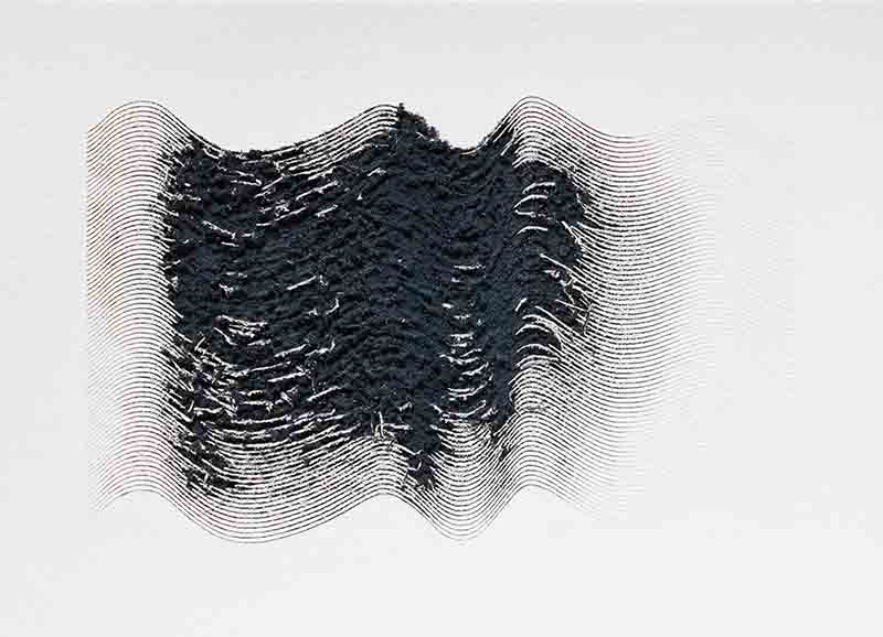 La sperimentazione sui materiali ha portato Marcolongo anche a confrontarsi con le mille potenzialità della carta e di sfruttarne tutte le possibilità formali. Nascono da qui le “Geografie di carta” e le “Arature”, dove il materiale perde la sua caratteristica di bidimensionale tabula rasa per acquisire una prospera vitalità formale. La punta che la intarsia, come un vomere, riversa ai bordi eleganti rimasugli di cellulosa da riporto che, a sbalzo, tramutano il foglio in una minuta geografia di crinali e avvallamenti.