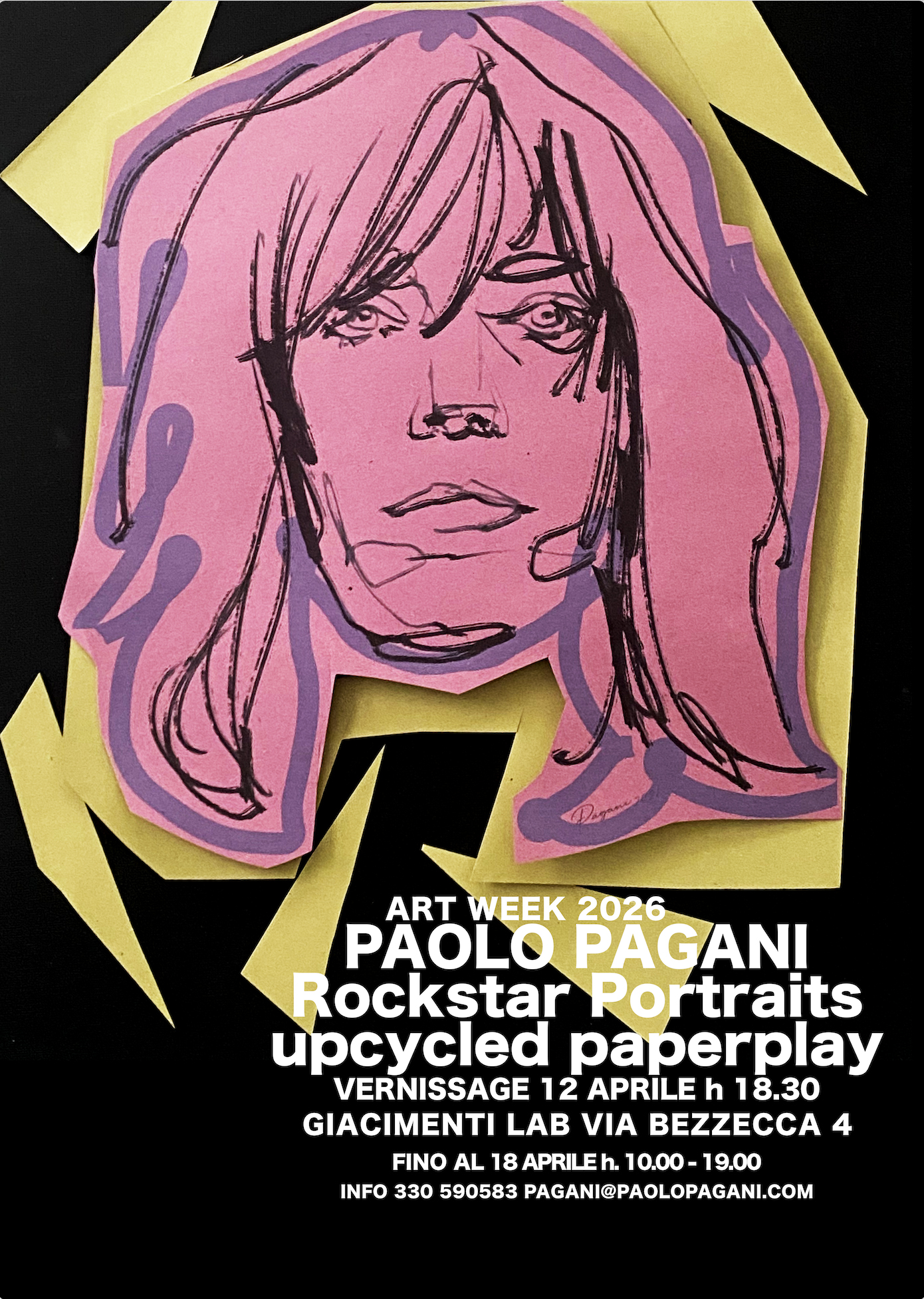Mostra di Paolo Pagani: Rockstar Portraits: upcycled paperplay Dal 12 aprile al 18 aprile Giacimenti Lab via Bezzecca 4 Milano
