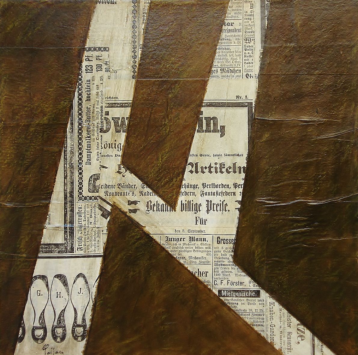 Questa volta, però, espone un percorso completamente diverso. I suoi quadri, di nuovissima produzione, hanno titoli molto simili tra loro, sono squarci che visivamente propongono zone buie, di colori semplici, come abbiamo spesso già visto nei suoi lavori, quindi tinte che vanno dal nero, al rosso, verde e blu, letteralmente squarciate da ritagli di giornale di cui possiamo individuare vagamente il contenuto. Sono giornali del passato, cercati tra le bancarelle di antiquariato con uno scopo ben preciso, quello di aiutarci ad “andare oltre”, creando un vero e proprio viaggio, a livello mentale, che parte appunto dal passato, vede il presente, come qui e ora, luogo e momento in cui ognuno di noi si pone le domande sulla propria esistenza e futuro, perché solo grazie al passato e alle risposte che ci diamo nel presente, possiamo vivere in modo migliore ciò che è in serbo per noi.