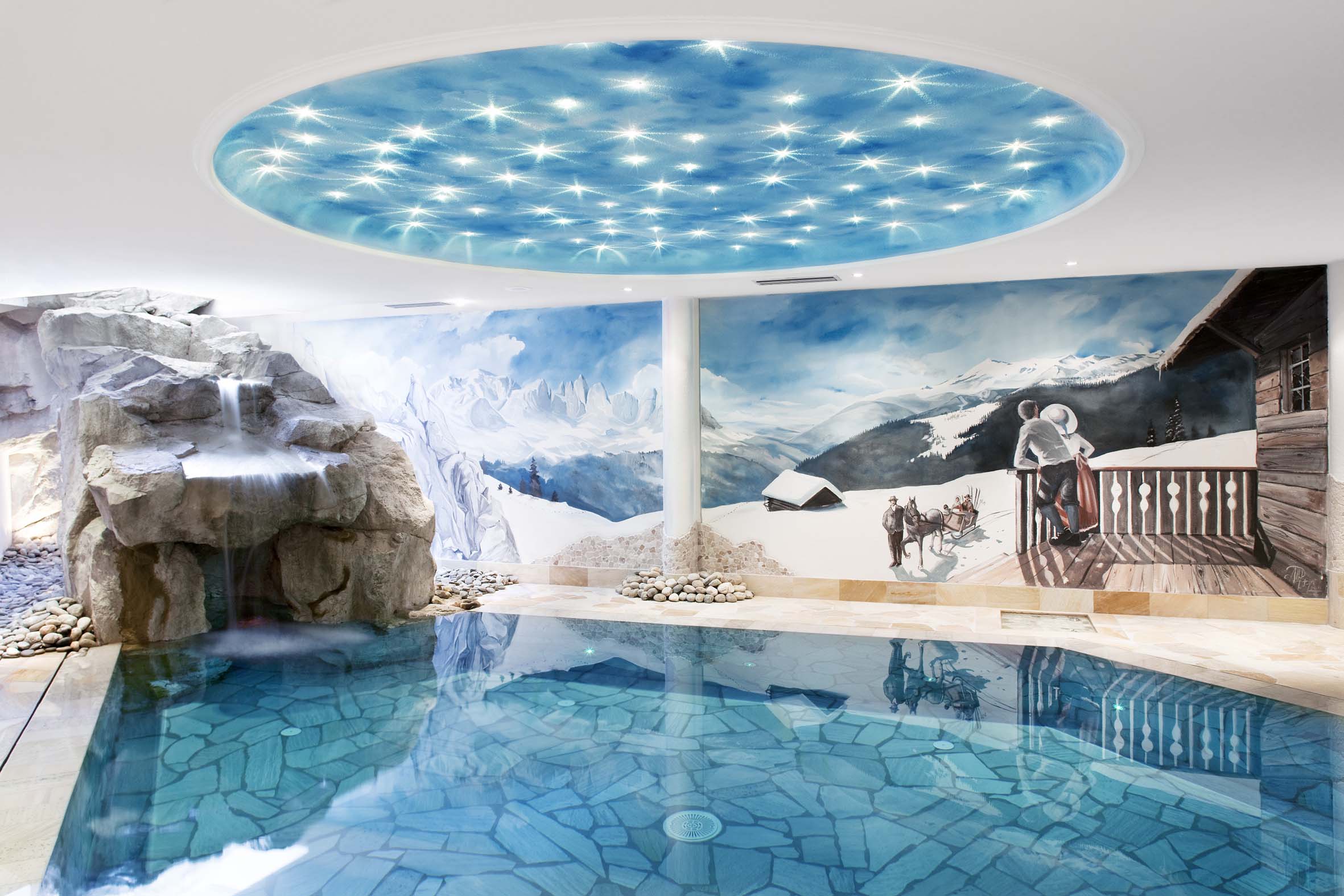 Riprodotte in diverso formato sono mostrate altre immagini di piscine in interni di hotel, il cui allestimento è costituito da una serie di riproposizioni di paesaggi dai riferimenti ben precisi, che toccano sia il gusto esotico - la palma, le dune - sia l’atmosfera da dipinto romantico con qualche lezioso capriccio - il ponticello di legno, il castello arroccato, qualche rovina classica – sia la riproduzione di cime innevate contemplate dal balcone di uno chalet di montagna da personaggi in costume tradizionale. Fuori dalla struttura ricettiva si staglia nella sua realtà e palpabilità il paesaggio montano, quale si può appunto ammirare da Cavalese, Silandro o Luson.