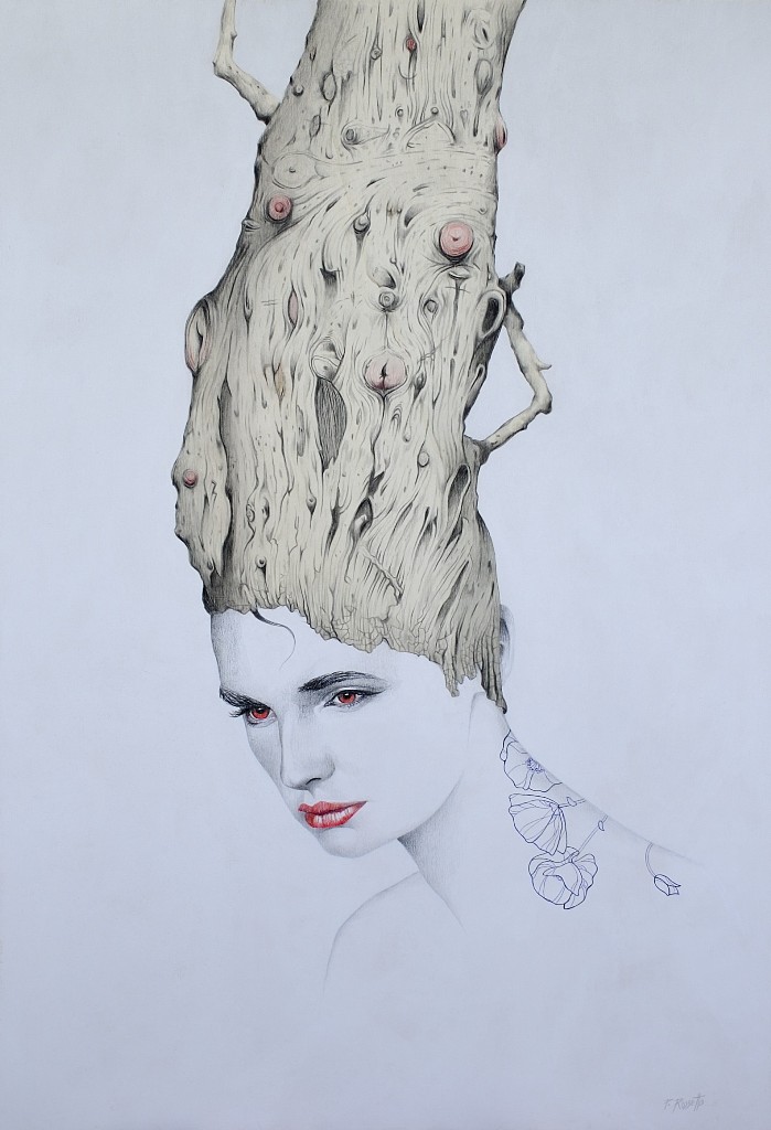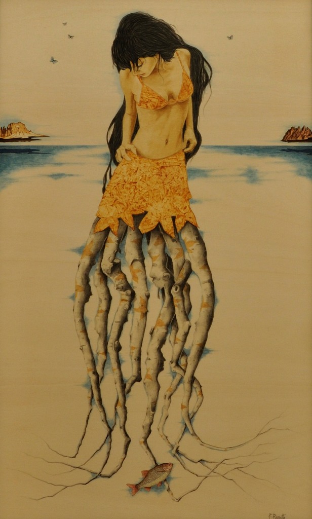Nato a Bolzano, dove anche oggi vive e lavora, Paolo Rossetto vanta un variegato e interessante curriculum critico-espositivo fatto di mostre, personali e collettive, tenute in tutta Italia e in svariate capitali d'Europa. Tra queste una menzione particolare meritano senza dubbio le sue partecipazioni alla 58a Biennale Internazionale d'Arte di Venezia (Pad. Grenada) e alla quarta edizione della Triennale di Roma presso la Galleria del Cembalo di Palazzo Borghese. Seguendo l'istinto di libertà comune a molti artisti, abbandona ben presto gli studi di ragioneria per frequentare l'Istitudo d'Arte di Trento dove , nel 1990, si diploma “maestro d'Arte”. Da qui inizia dunque il suo percorso espressivo che, dopo un periodo “figurativo” caratterizzato soprattutto da paesaggi e nature morte, subisce una graduale e meditata metamorfosi sfociando in un linguaggio fortemente personale, libero e creativo, dominato da una interessante e sentita simbologia di gusto surreale. In questa nuova dimensione, fatta di fantasia e creatività, di sogno e riflessione, Paolo Rossetto trova stimoli e input nuovi, energie fresche e spontanee per dare corpo e voce a colori e materia che, nelle sue mani, acquistano valori e significati intensi, diventano simbolo e metafora dei nostri giorni, si fanno linguaggio estetico nuovo e contemporaneo. Arte intensa e sentita, quella dell'artista altoatesino, quasi un prolungamento della sua stessa vita, un bisogno autentico di esternare emozioni, sentimenti e stati d'animo per un'espressione tutta d'istinto, libera e creativa, al di fuori degli schemi accademici, quasi un atto liberatorio, un'esigenza intima di trasmettere messaggi e farsi veicolo di comunicazione. Pittura tutta incentrata sul rapporto uomo-natura e sulla grande simbologia dell'albero, come riferisce lo stesso artista: “attraverso la simbologia dell'albero cerco di rappresentare gli stati d'animo, le condizioni esistenziali ed i grandi temi della natura. Il mio è un lungo, accorato appello tra uomo e natura per cercare di capire le ragioni della vita”. Mai come oggi il rapporto tra uomo e natura è diventato un tema di assoluta centralità, tanto nei dibattiti scientifici, quanto in quelli estetico-artistici. Sempre più frequentemente, infatti, gli artisti, in linea con il sentire comune diffuso dell'epoca attuale, fondano la loro ricerca artistica sull'esplorazione della relazione uomo-natura. Un argomento, questo, che da sempre affascina antropologi, biologi, naturalisti e studiosi, interessati a comprendere questo strano, eppure imprescindibile legame, che molto spesso si tramuta anche in conflitto. Ma di assoluto interesse è senza dubbio il modo in cui lo affronta Paolo Rossetto, perchè nuovo e imprevedibile, creativo a fantastico, surreale, appunto, e proprio per questo aperto a soluzioni impossibili e inimmagginabili. Così le sue tavole sono popolate da donne affascinanti che sembrano emergere da tronchi contorti di antichi alberi o da ritratti femminili dai capelli lunghissimi formati da rami infiniti. Sono corpi diafani, sospesi in dimensioni irreali e intrisi di mistero dove gli arti o il busto cedono il passo ad una lenta e inesorabile metamorfosi, ad una imprevedibile e insospettata trasmutazione fino a diventare un tutt'uno con l'elemento naturale o vegetale che le circonda. Sono creature misteriose e irreali, eppure vive e concrete, Ninfe e Dee di questa nostra complessa contemporaneità, ma sono altresì percorse da una sensibilità inquieta, da un senso di profondo scoramento e delusione per dover vivere in una natura ferita, distrutta e fortemente compromessa dall'azione irresponsabile dell'uomo. Allora sembra che queste creature trovino nel loro trasformarsi e modificarsi la sola ed unica via d'uscita da una situazione diventata ormai impossibile. In queste opere il tempo sembra essersi fermato: passato, presente e futuro, mitologia e modernità, uomo e natura convivono insieme, immersi in una dimensione irreale e scardinata dalla logica del tempo e dello spazio, eppure straordinariamente affascinante, magica e coinvolgente.