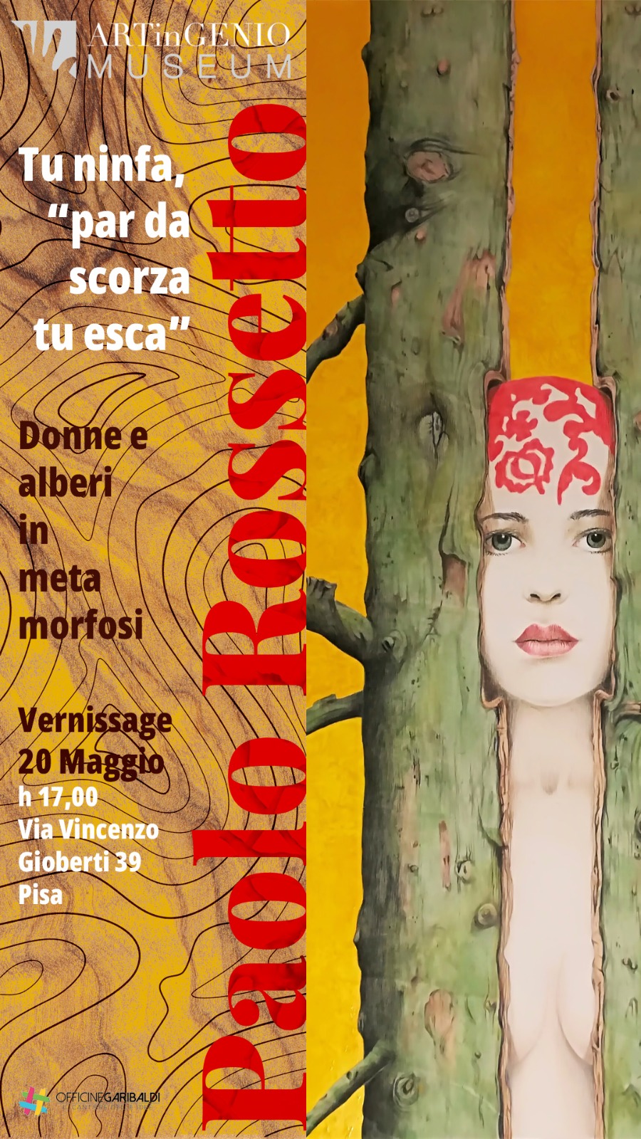 Tu ninfa “par da scorza tu esca” Donne e alberi in metamorfosi. E’ questo il titolo della nuova mostra a cura di Artingenio Museum aperta al pubblico dal 20 maggio al 10 giugno nel centro espositivo delle Officine Garibaldi di Pisa (ingresso gratuito). Nelle sue opere il Maestro Paolo Rossetto si fa interprete della contemporaneità con un linguaggio surrealista inteso a restituire al pubblico il profondo legame tra natura e genere umano che è in grado di cogliere tutte le sfumature dell’animo femminile con una singolare abilità pittorica. Il vernissage di inaugurazione, sabato 20 maggio alle 17 alle Officine Garibaldi, sarà un’occasione per visitare la mostra, incontrare e dialogare con l’artista e partecipare alla presentazione del catalogo critico a cura di Francesco Corsi, direttore di Artingenio Museum, e di Laura Luciano. Le opere di Rossetto sposano l’armonia con la bellezza, la sensualità e il mistero di corpi e volti femminili, integrati in perfetto equilibrio nei tronchi e tra i rami degli alberi, trasportandoci in una realtà surreale, carica di emozioni primordiali che ci riportano a contatto con la nostra essenza più profonda. Donne che, come ninfe dei boschi, coi loro occhi limpidi e immensi, rivelano al mondo le suggestioni dell’animo femminile, così delicato quanto forte, nobile come il legno, frutto prezioso dell’albero. Ed è proprio il legno, come elemento vivo, materia naturale capace di trasmettere e generare energia, senso di calore e benessere, il protagonista indiscusso del percorso artistico di Rossetto, che insieme alla donna, “domina”, signora e madre, che generano la vita e ci connettono con il tutto. Vittorio Sgarbi lo definisce “armonioso e raffinato”, “adotta le tempere, gli oli, gli acrilici e il carboncino, ma anche i pigmenti in polvere, seguendo la medesima procedura usata dagli artisti del Trecento”.